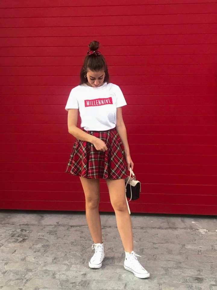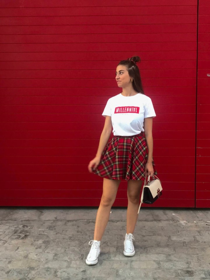 Para las fotos decidí combinarla con playeros y camiseta básica, ambos en blanco. Sin embargo, admite tanto unos botines de plataforma y un jersey de punto para ir abrigada al trabajo como un taconazo y una blusa más sobria para asistir a cualquier cita. Eso sí, al ser tartán rojo, cuidado con los colores y los estampados.