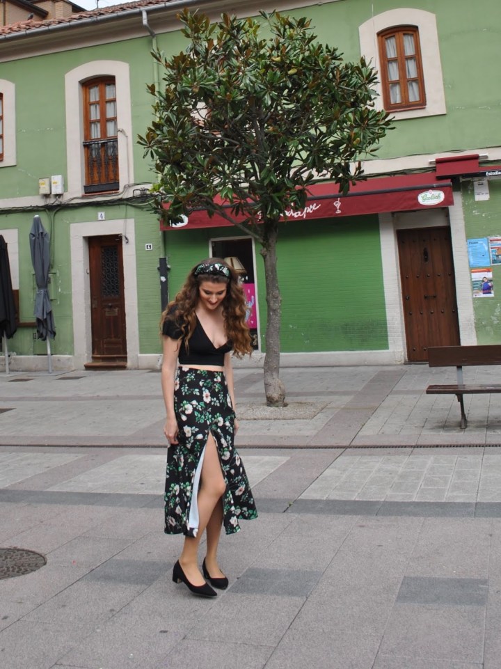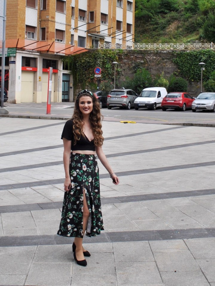 Ella buscaba una falda de fondo oscuro, con estampado en colores otoñales —a poder ser, de flores— y de corte midi. Además, después de haber visto el diseño de Helena, estaba convencida de atreverse con la abertura lateral.