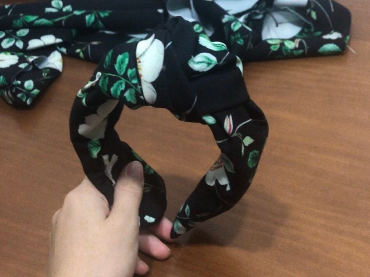 Y, dado que sobró algo de tela y que María tiene esa melena tan bonita, le llevé de sorpresa dos complementos para el pelo, en caso de que quisiera adornar su look: un lazo para una coleta y una diadema rígida. Aunque quedó maravillada con los dos, optó por la segunda.