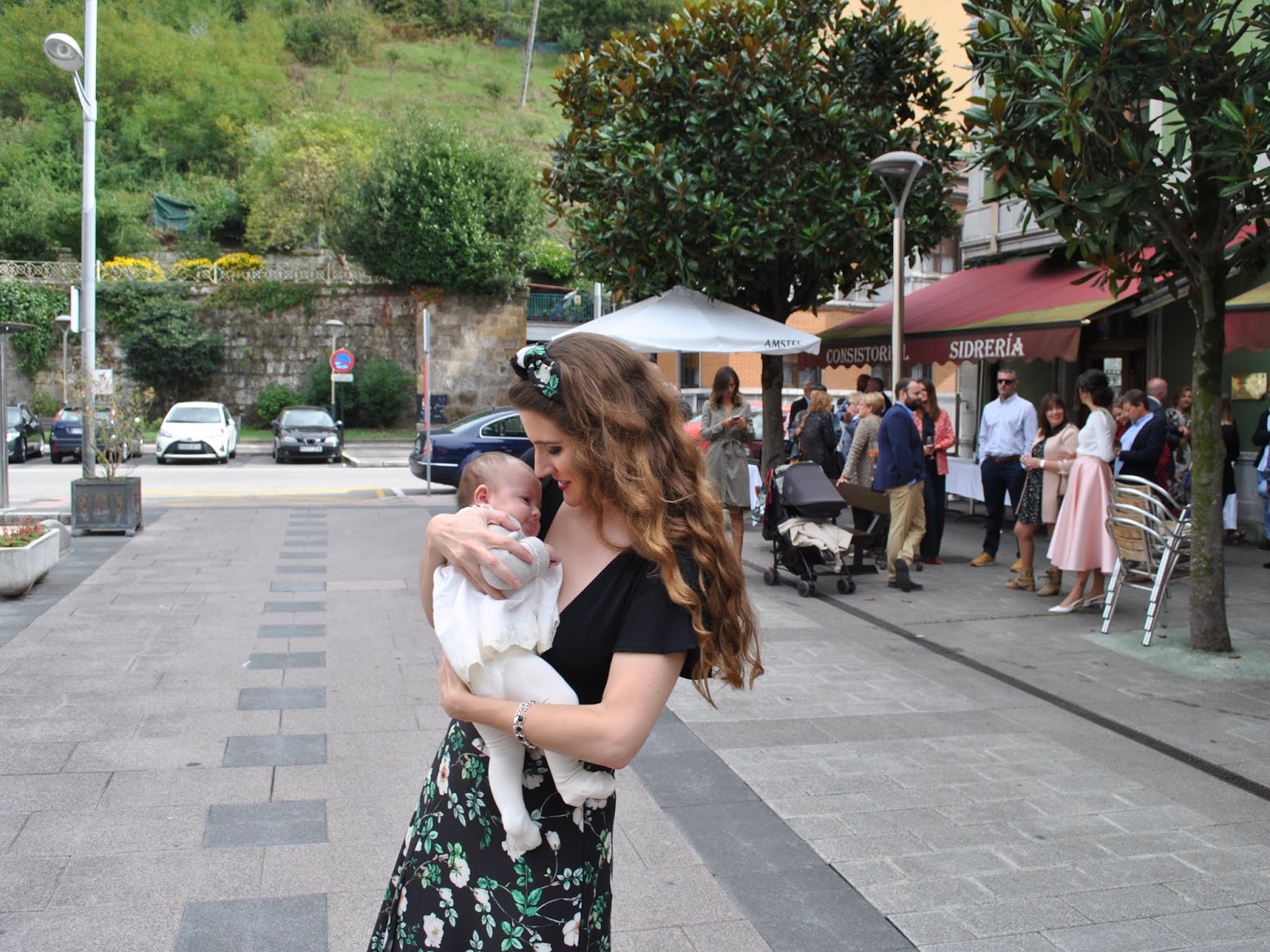 Y, dado que sobró algo de tela y que María tiene esa melena tan bonita, le llevé de sorpresa dos complementos para el pelo, en caso de que quisiera adornar su look: un lazo para una coleta y una diadema rígida. Aunque quedó maravillada con los dos, optó por la segunda.