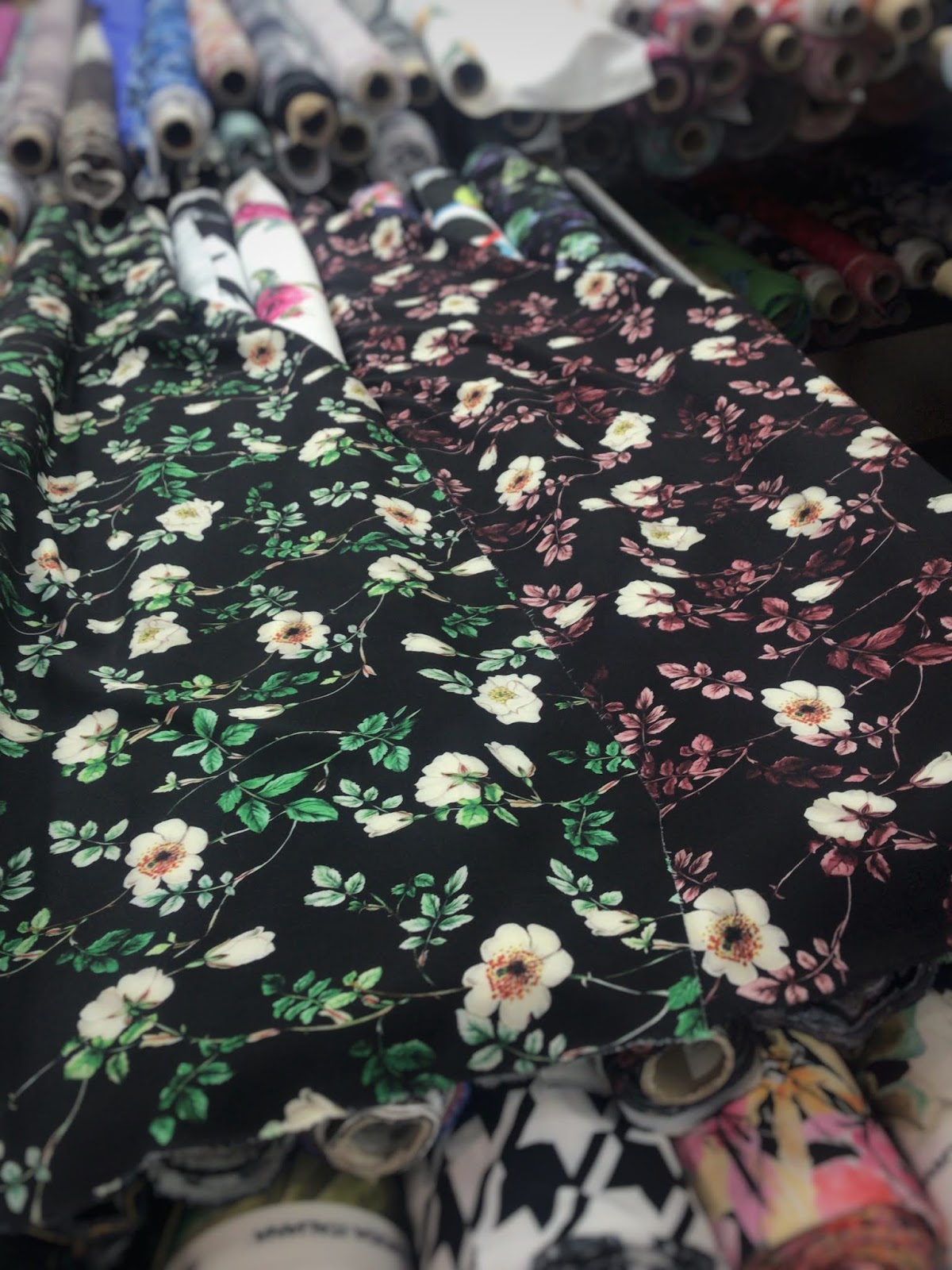 Hasta el último momento ambas estuvimos dudando entre estas dos telas: mismo estampado, pero diferente color. Al final nos decantamos por el verde, porque creímos que alegraba la falda con un toque de luz.