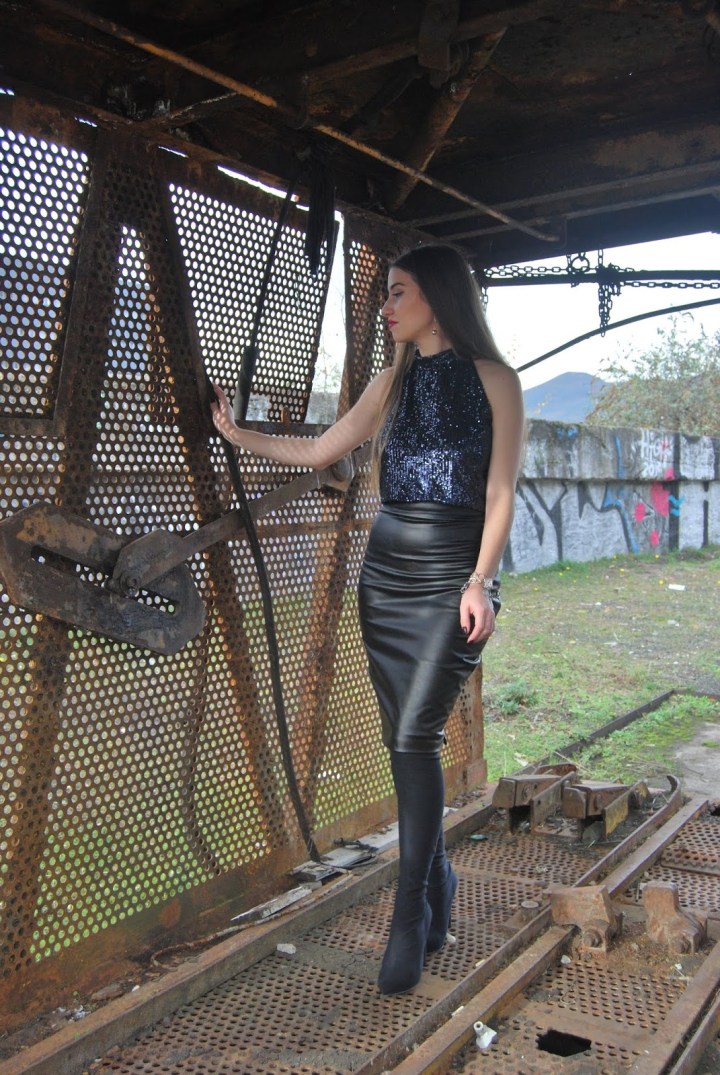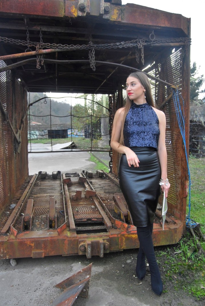 En mi cabeza lo visualizaba combinado con uno de los protagonistas de esta temporada: el efecto cuero. ¿Por qué no una falda entallada con la que añadirle un toque femenino a lo punk que aporta este género? Pues ya lo tenía: una falda lápiz de polipiel, por debajo de la rodilla, con una pequeña apertura en el trasero.