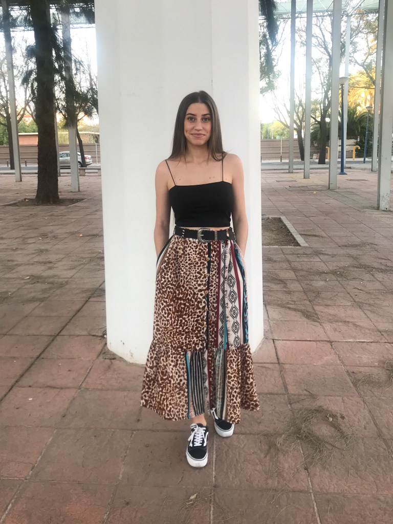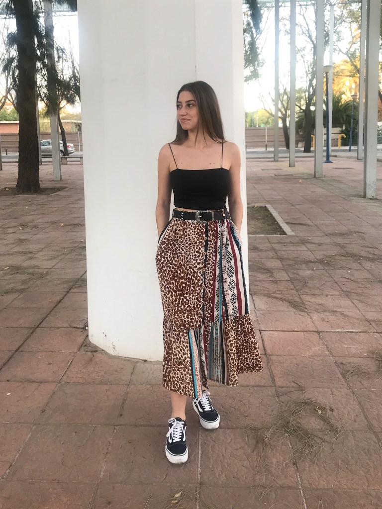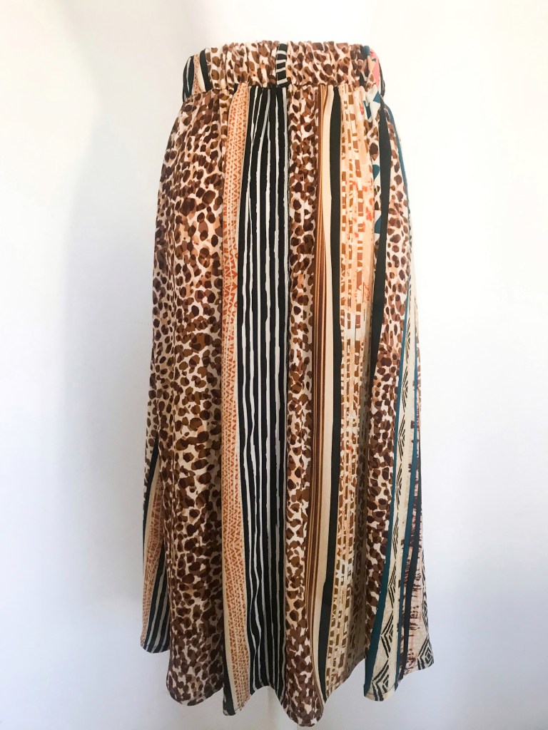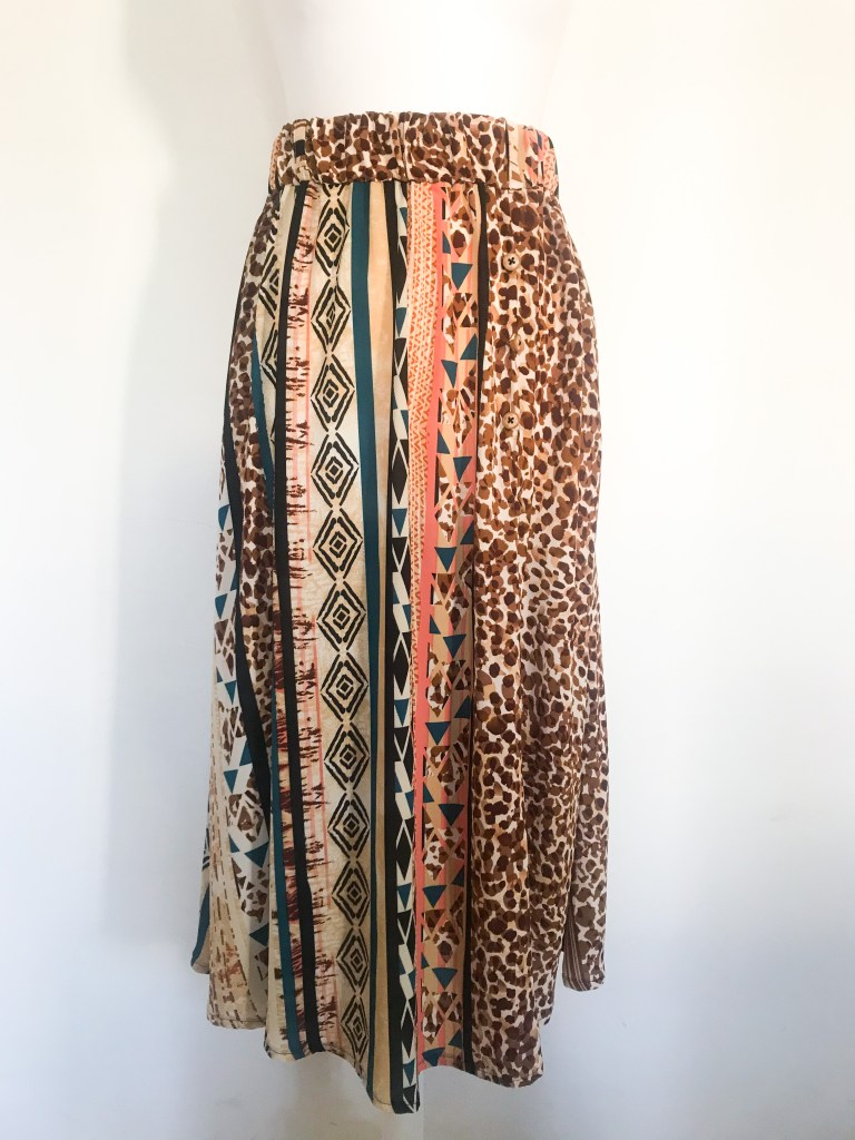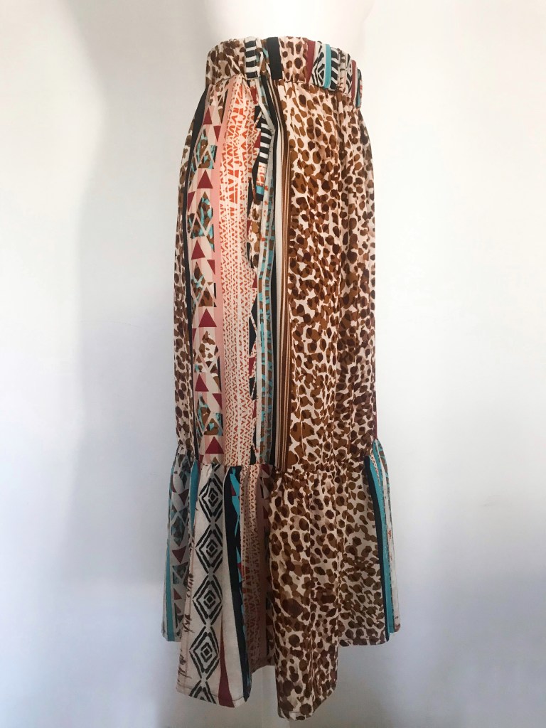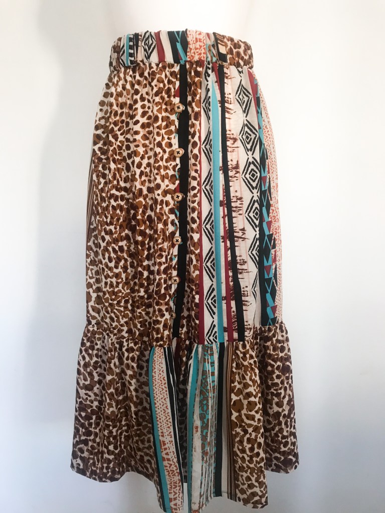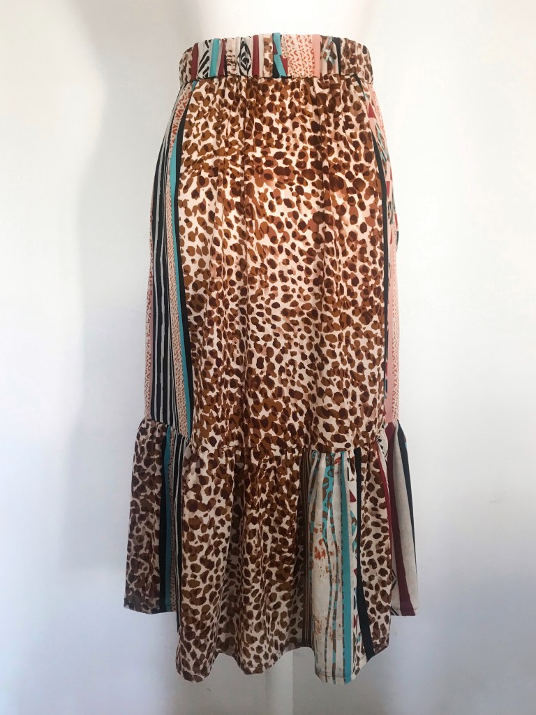 Modelo confeccionado en tejido crepé fino que mezcla animal print, rayas y motivos étnicos en tonos cálidos. Cortado mediante un patrón de falda acampanada con mínimo vuelo y holgura incluida en la cintura para que haga el frunce. Lleva una cinturilla de 5 cm con goma interior, cinco trabillas para cinturón y bolsillos incluidos en las costuras. Abertura lateral que abre a partir de los 32 cm, con presillas del mismo tejido y cinco botones efecto madera, de los cuales ninguno es funcional. Largo total de la falda 80 cm.