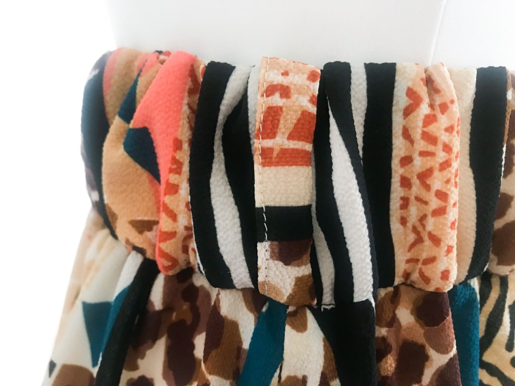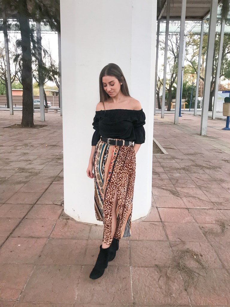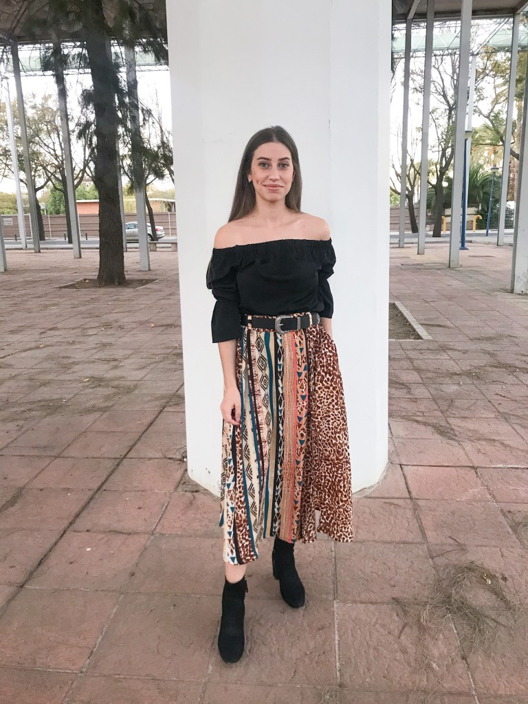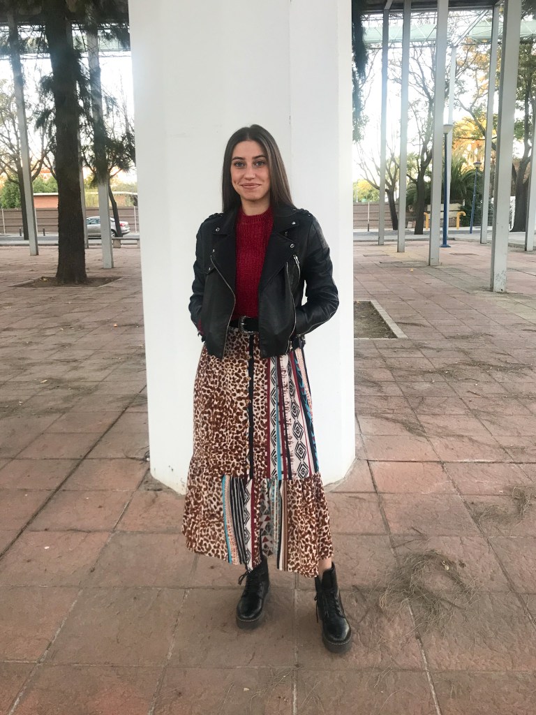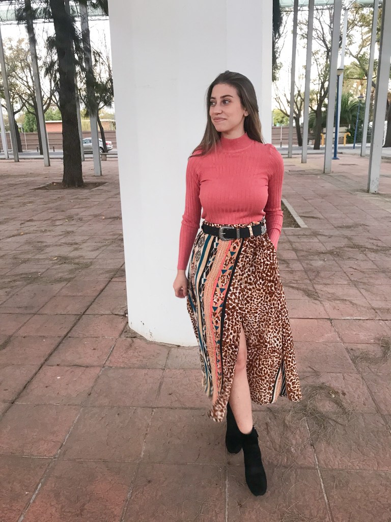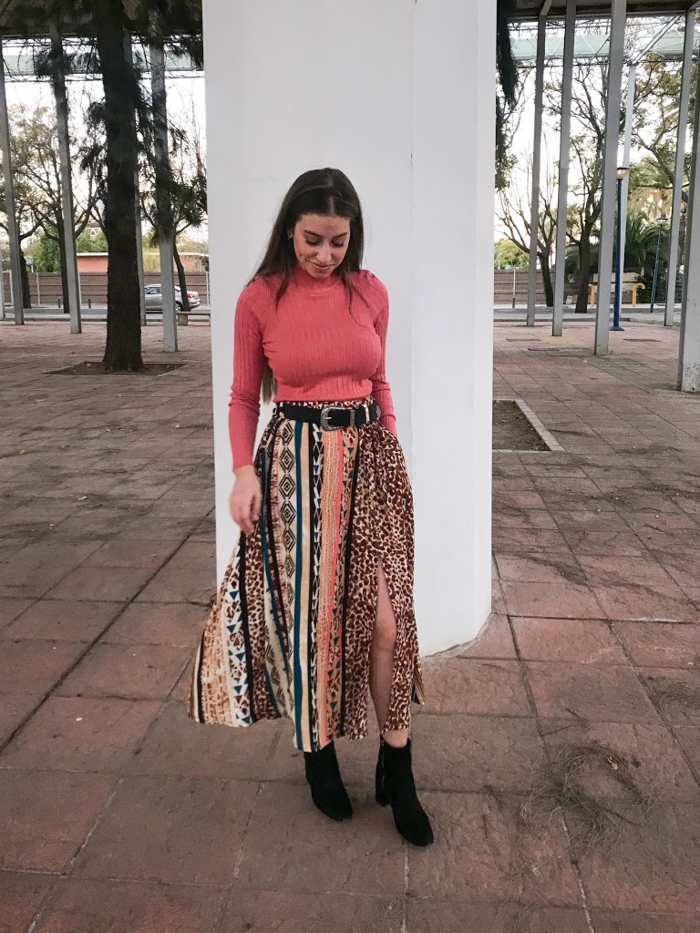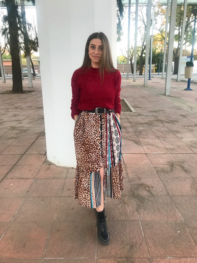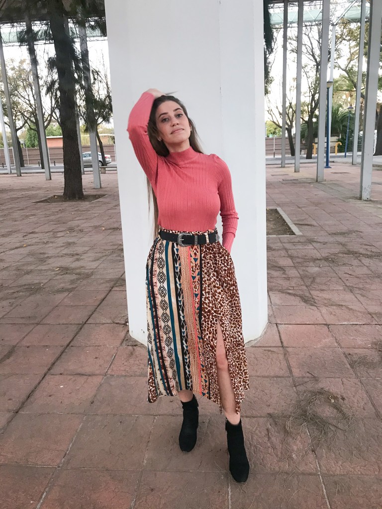 Modelo confeccionado en tejido crepé fino que mezcla animal print, rayas y motivos étnicos en tonos cálidos. Cortado mediante un patrón de falda acampanada con mínimo vuelo y holgura incluida en la cintura para que haga el frunce. Lleva una cinturilla de 5 cm con goma interior, cinco trabillas para cinturón y bolsillos incluidos en las costuras. Abertura lateral que abre a partir de los 32 cm, con presillas del mismo tejido y cinco botones efecto madera, de los cuales ninguno es funcional. Largo total de la falda 80 cm.