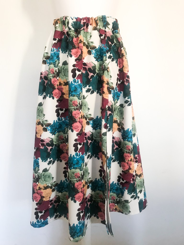 Modelo confeccionado en tejido bielástico, mediante un patrón de falda acampanada con mínimo vuelo y holgura incluida en la cintura para que haga el frunce. Lleva una cinturilla de 5 cm con goma interior, cinco trabillas para cinturón y bolsillos incluidos en las costuras. Abertura lateral que abre a partir de los 30 cm, con presillas del mismo tejido y cinco botones de color buganvilla, de los cuales solo es funcional el último, permitiendo que la abertura se cierre hasta los 36 cm (en las fotos este último botón está desabrochad). Largo total de la falda 80 cm.