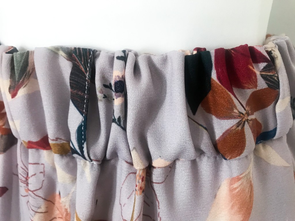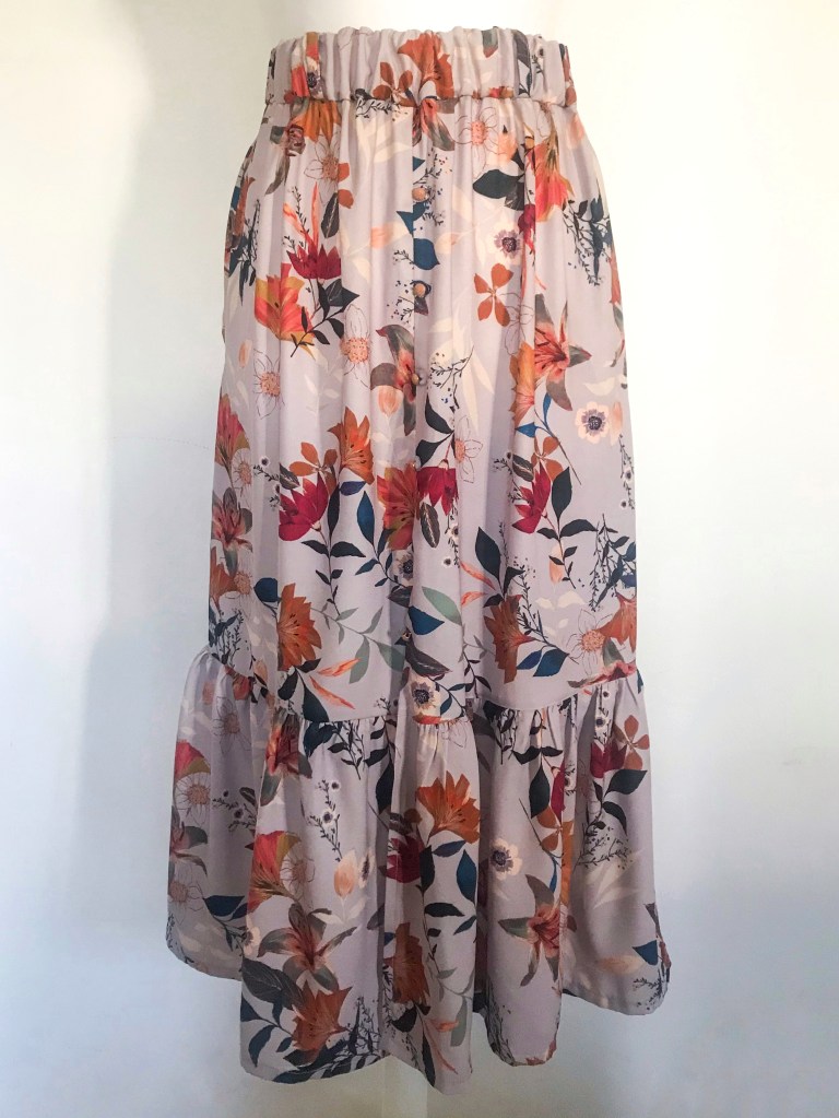 Modelo confeccionado en tejido crepé fino satinado con un fondo lavanda suave. Cortado mediante un patrón de falda normal, con la holgura necesaria para hacer el frunce. La falda lleva un corte a 50 cm para añadirle un volante de 30 cm. Lleva una cinturilla de 5 cm con goma interior, cinco trabillas para cinturón y bolsillos incluidos en las costuras. Esta vez la abertura va en el centro, y está cerrada hasta los 35 cm con presillas y seis botones metálicos en tono oro rosa , de los cuales el último es el único funcional, permitiendo cerrar la abertura hasta los 42 cm. (en las fotos este último botón está desabrochado). Largo total de la falda 80 cm.