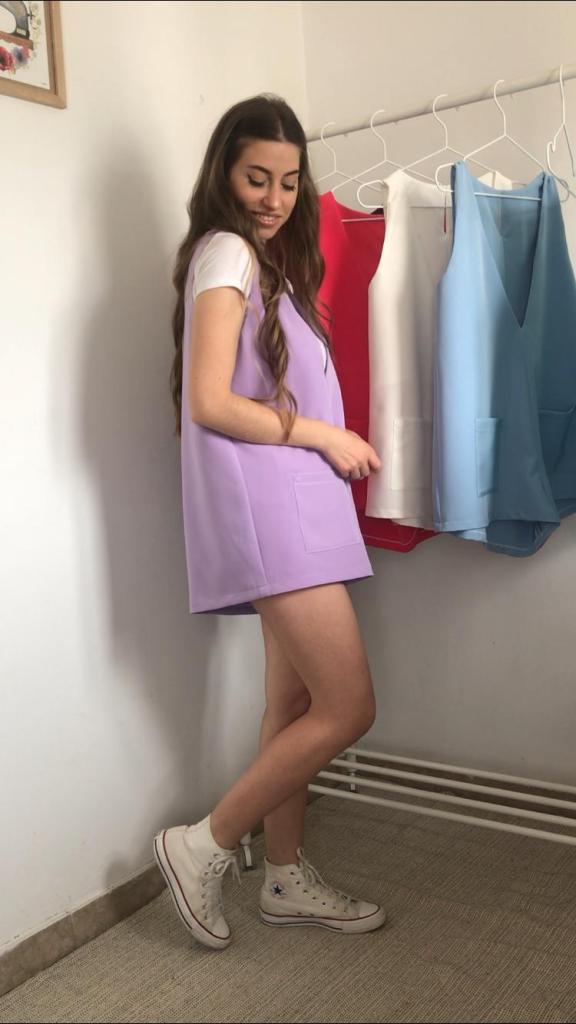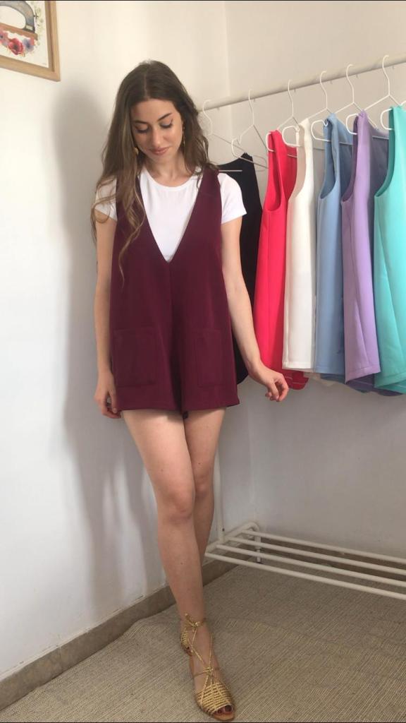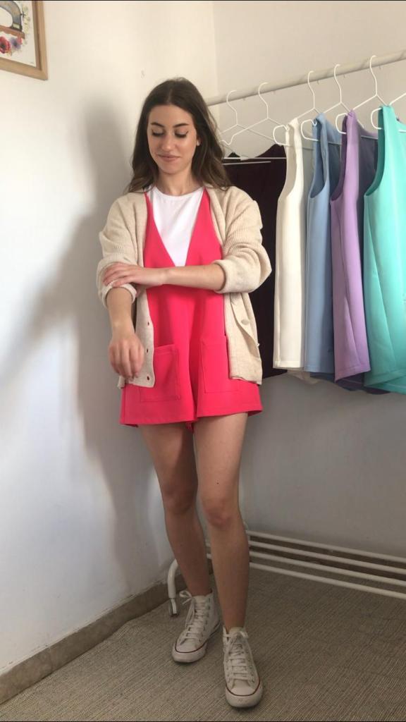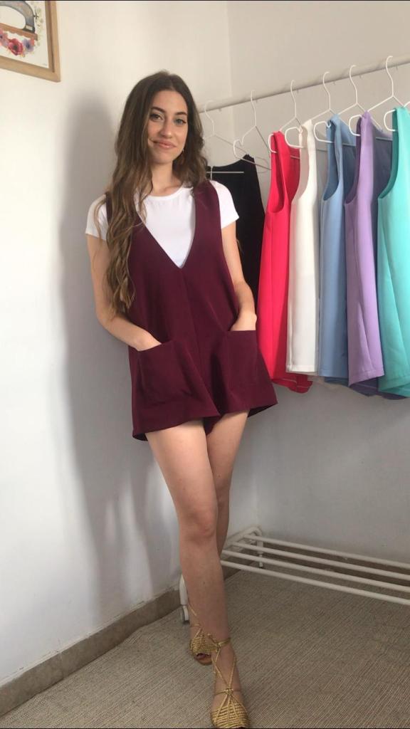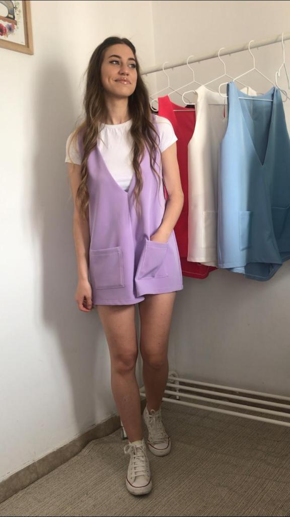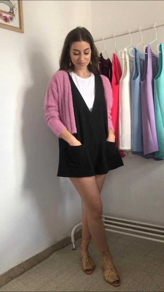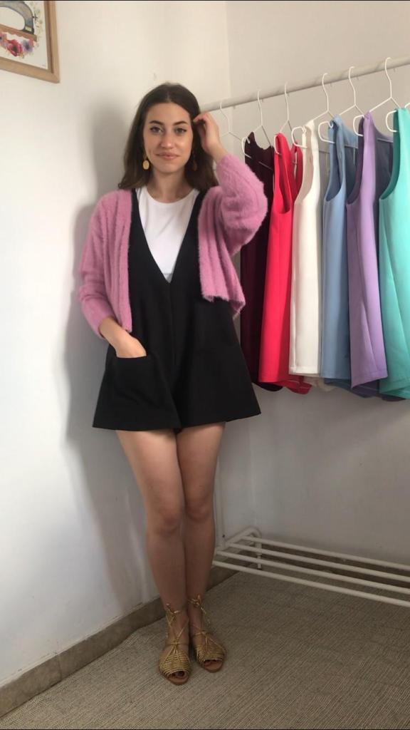 Además, todos los pichis son de talla única, que se corresponde con una M, aunque al ser una prenda holgada, su patrón está industrializado para que no quede pegado y sus medidas reales quedan en 96 cm de pecho y 120 cm de cadera, y un largo total de 70cm. Como veis en las fotos, debajo admite una prenda gordita tipo jersey. Tiene una lágrima en la espalda a modo de cierre, con un botón y presilla de hilo. También tiene incorporados dos bolsillos de plastrón de 14×14 cm. Yo mido 1.64 m, para que os sirva como orientación ya que los muestro puestos en mí.