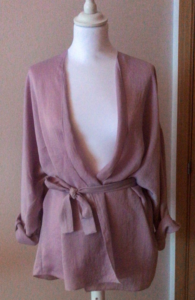 Kimono en mikado satinado fino. El remate del cuello es una tira doble de 5,5 cm, que queda algo más corta a modo de solapa, y el de los puños es una tira doble de 5 cm. Ambos remates son del mismo género y el bajo está rematado con puntada de doble orillo.Largo de la manga 52 cm.