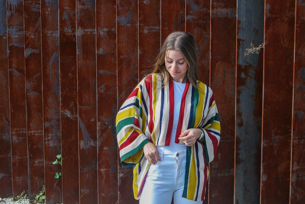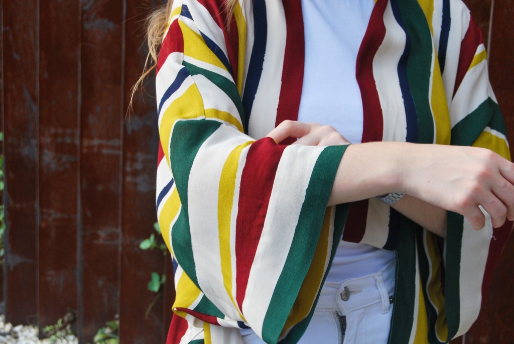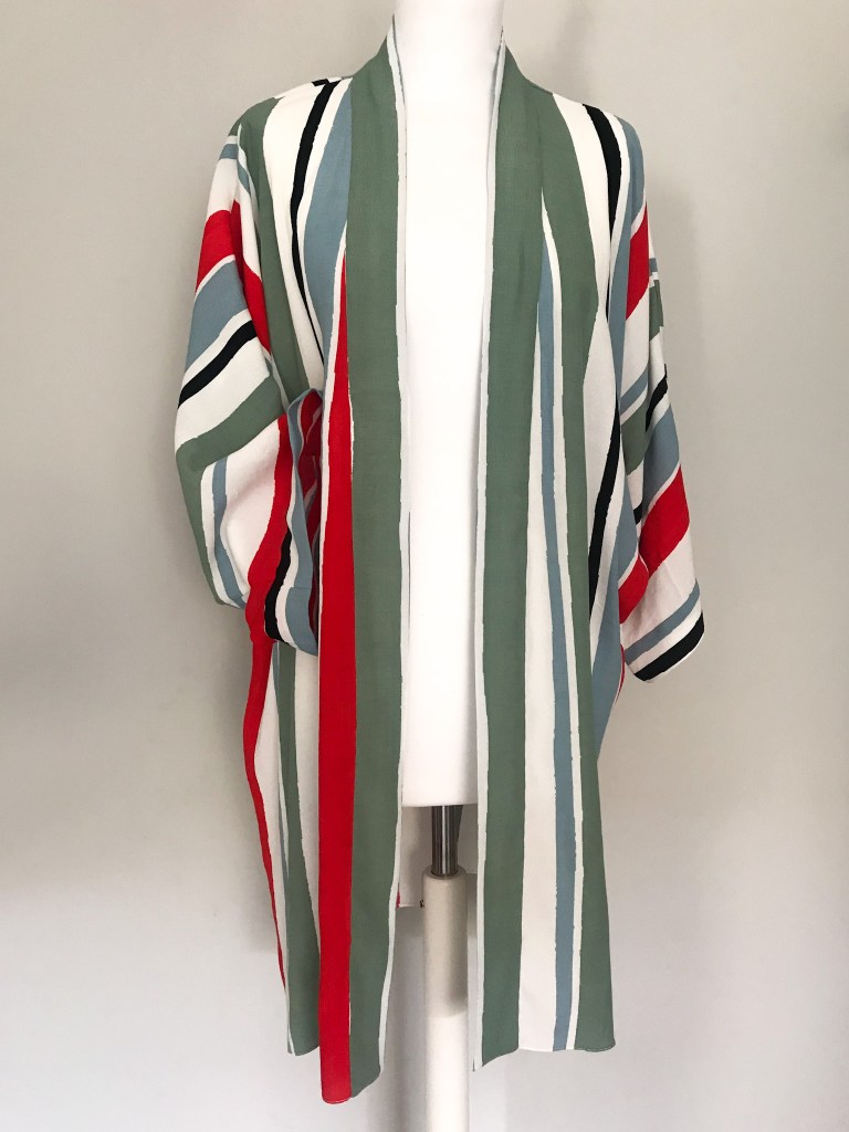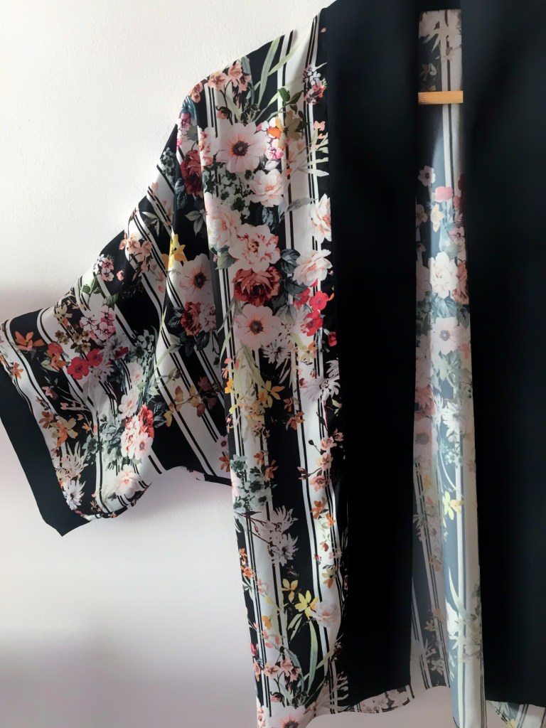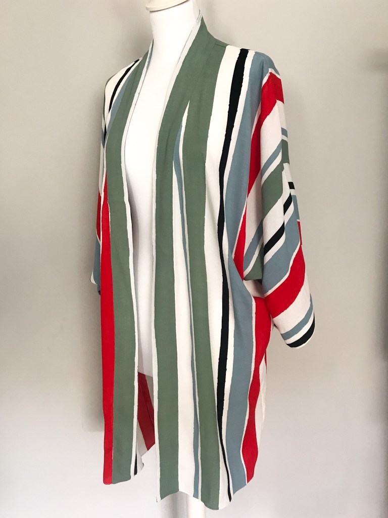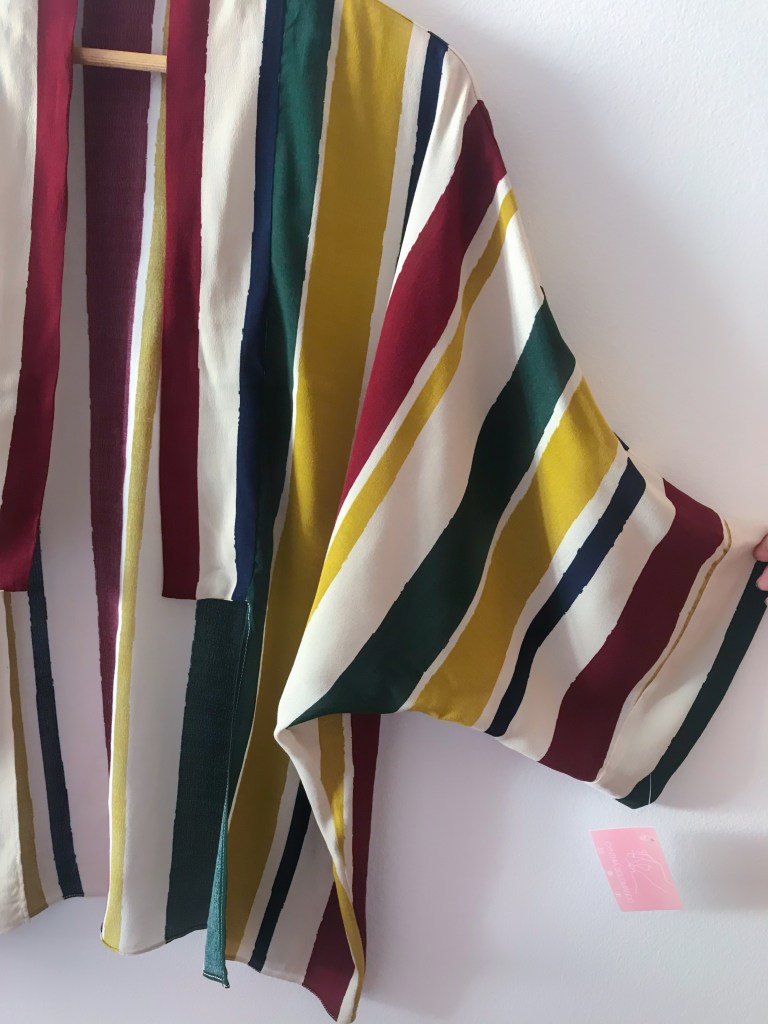 En esta ocasión coloqué las rayas de forma vertical, no porque estilicen más (que también), sino porque me encajaban mejor para ambas prendas. Hice lo mismo que con un kimono ordinario: le añadí una tira de 5 cm el cuello y los puños, y lo confeccioné con costura francesa.