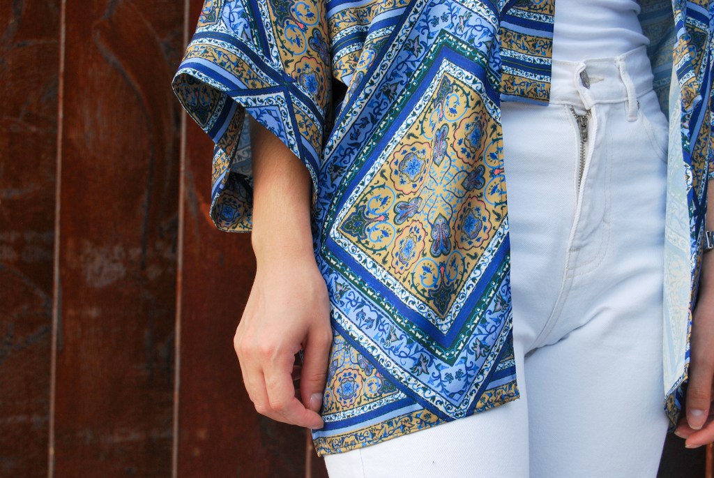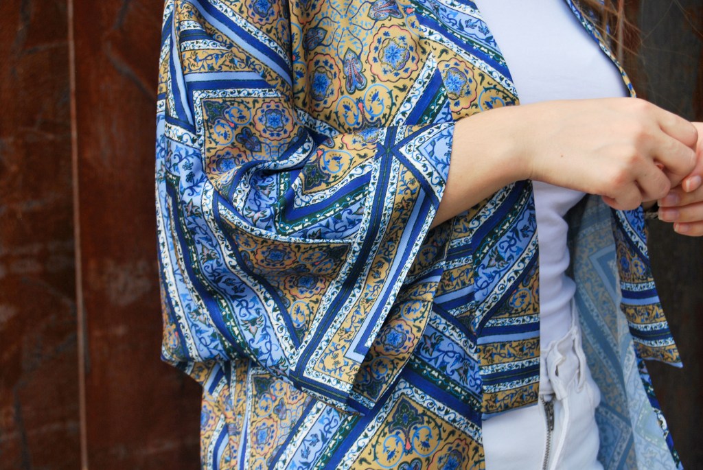 Pero como necesitaba ponerme algo por encima llegada la noche, confeccioné un kimono en el mismo tejido, pasa así darle una continuidad al estilo oriental del diseño. Esta vez lo hice con un patrón distinto a todos los kimonos que he hecho hasta la fecha, pero esto os lo detallaré más adelante en un post que tengo preparado para este tipo de kimono.