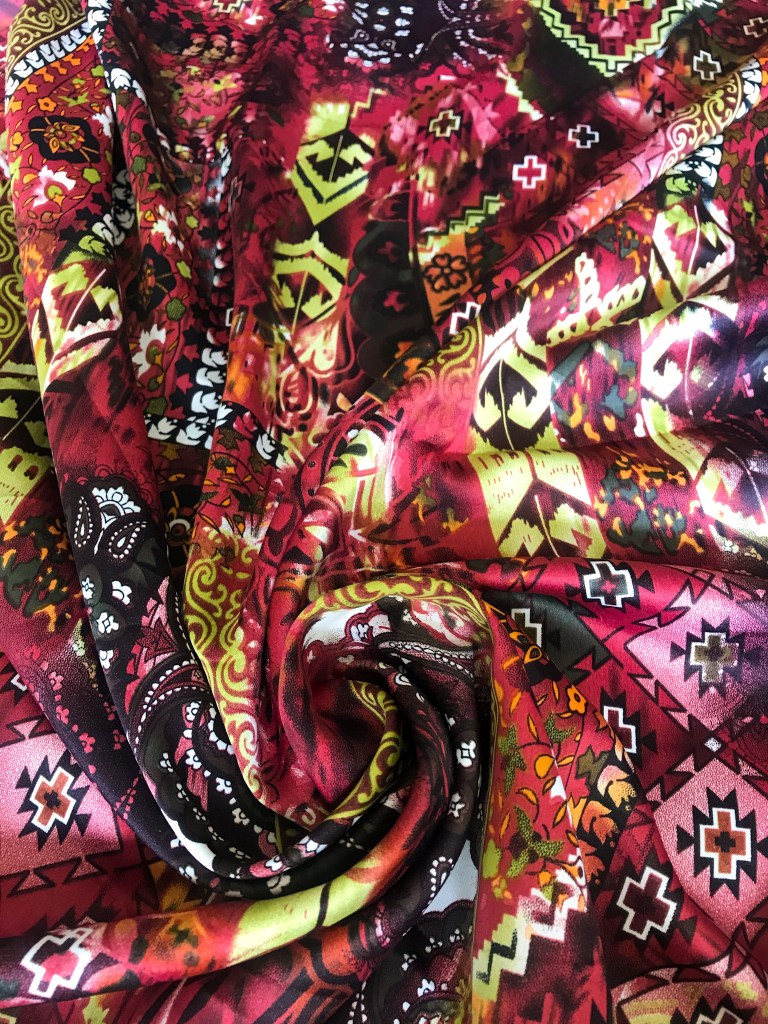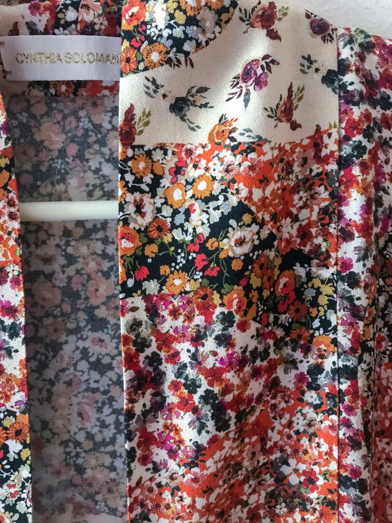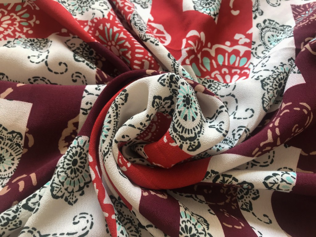 La idea inicial del kimono era hacerlo en terciopelo, pero no encontramos ninguno que nos convenciera, así que al ver este crepé finito casi georgette fuimos a por él. Además, combinaba a la perfección con el rojo gracias a los tonos que tenía en su estampado.