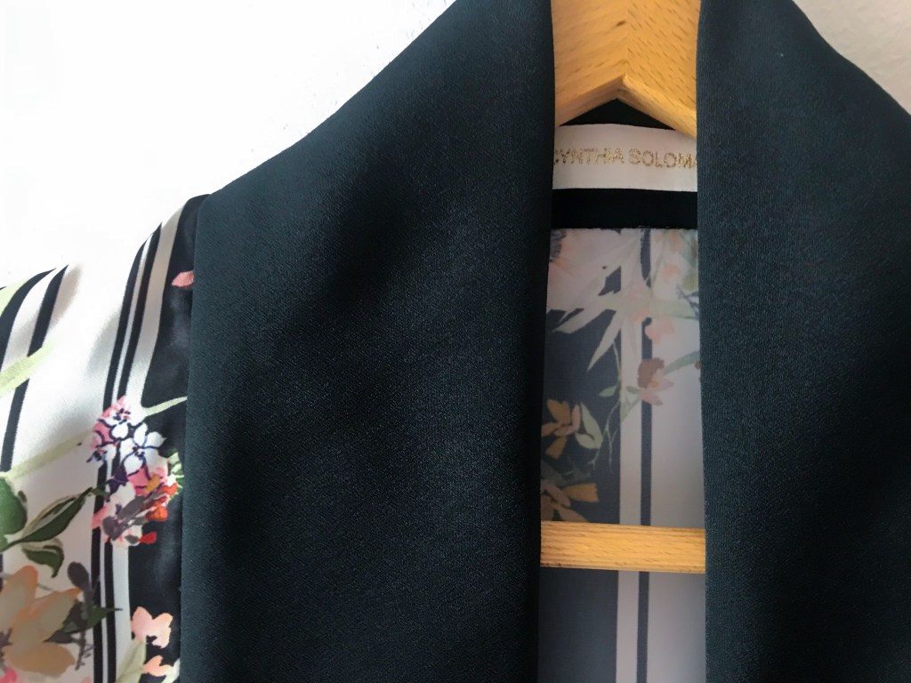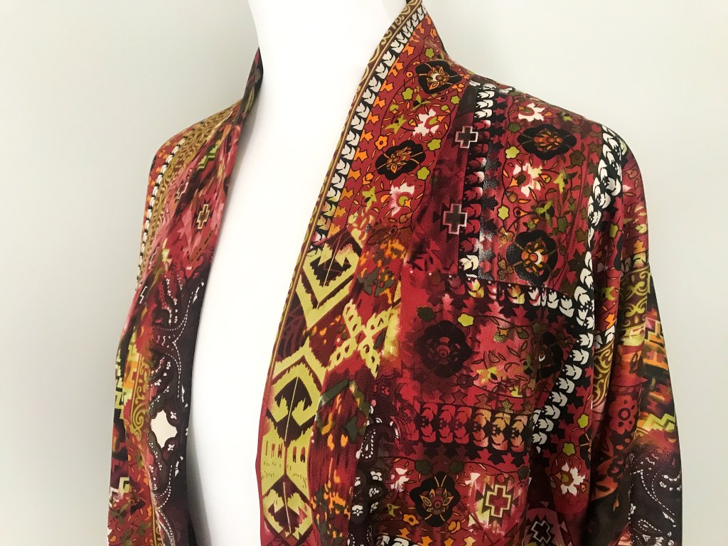 Kimono en satén estampado. El remate del cuello es una tira doble de 8 cm y el de los puños de 3,5 cm, ambos en georgette negro, distinto al estampado del propio kimono. El bajo está rematado con puntada de doble orillo. Largo de la manga 51 cm.