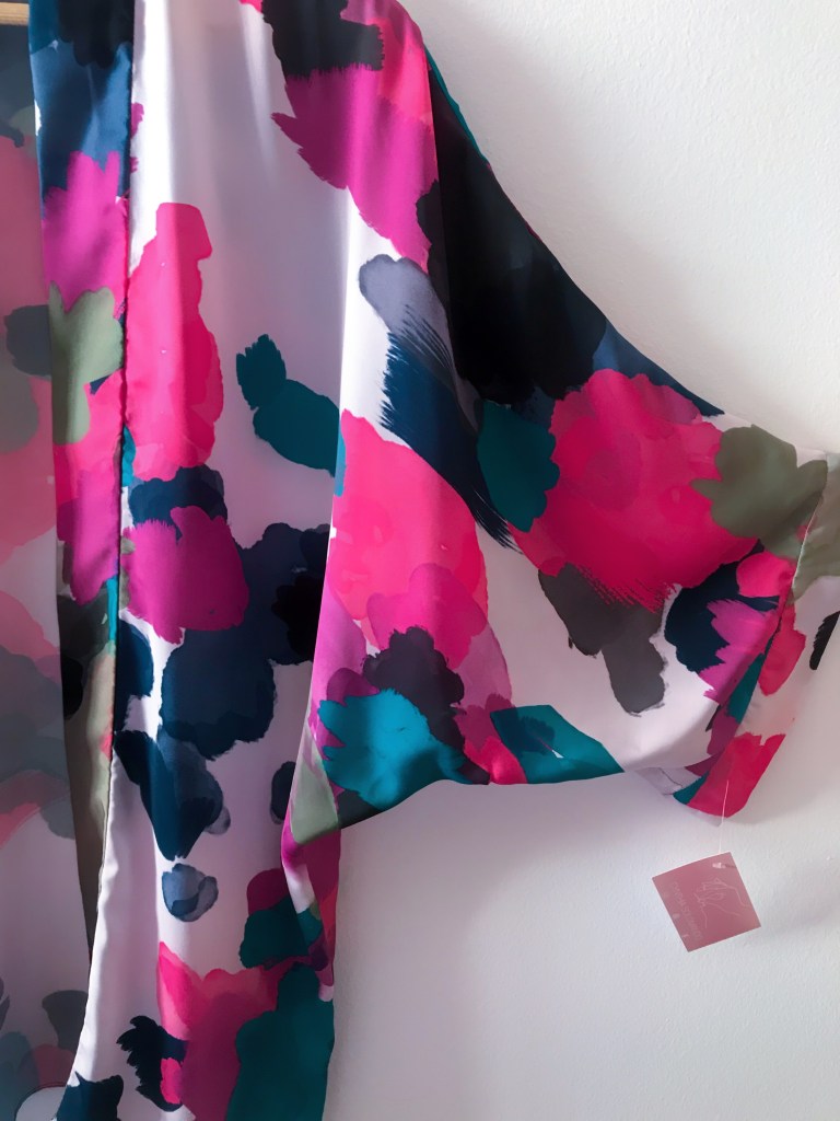 Este kimono está confeccionado con un satén que combina un fondo en blanco con grandes flores rosas y fucsias y un toque verde de sus ramas.