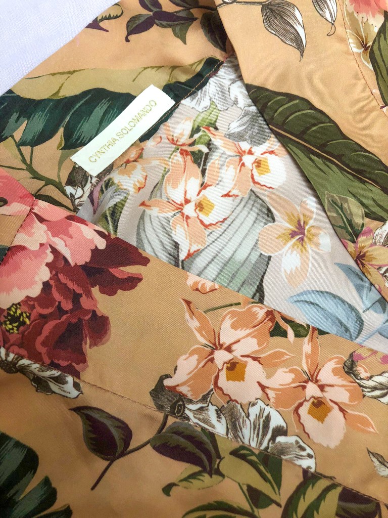 Busqué un tejido satén con un estampado de flores a petición de mi “clienta”, y al encontrar este lo vi clarito: era el elegido. Jugué con el contraste que proporcionaba el azul, colocándolo en las mangas y el bajo, de manera estratégica.