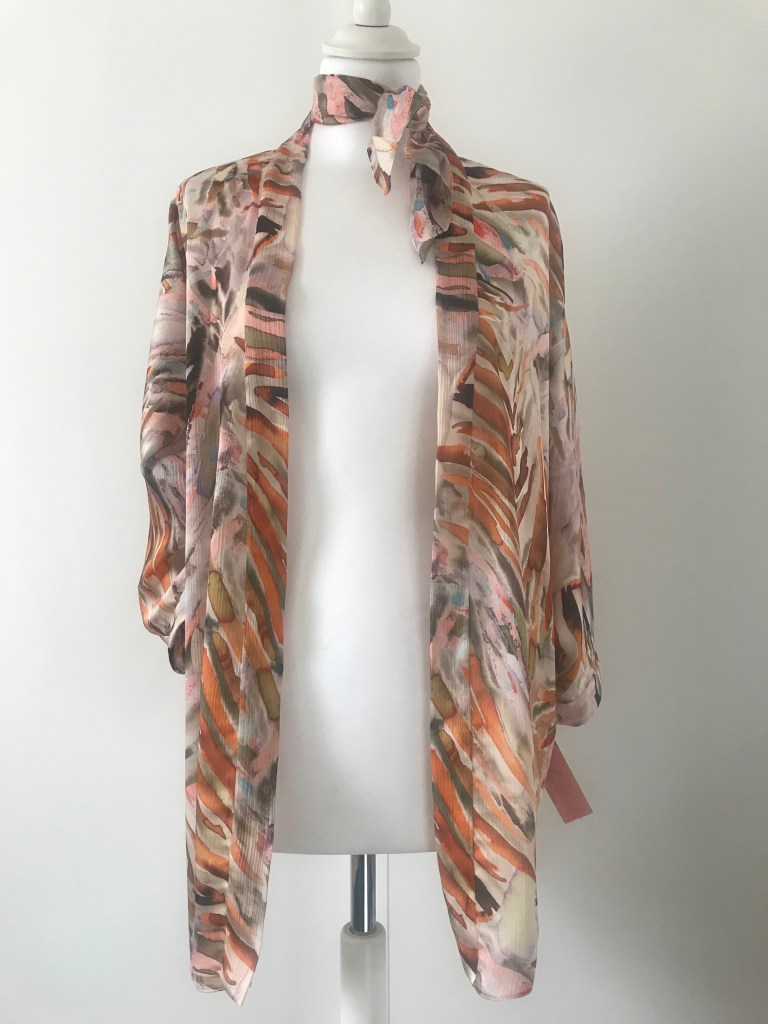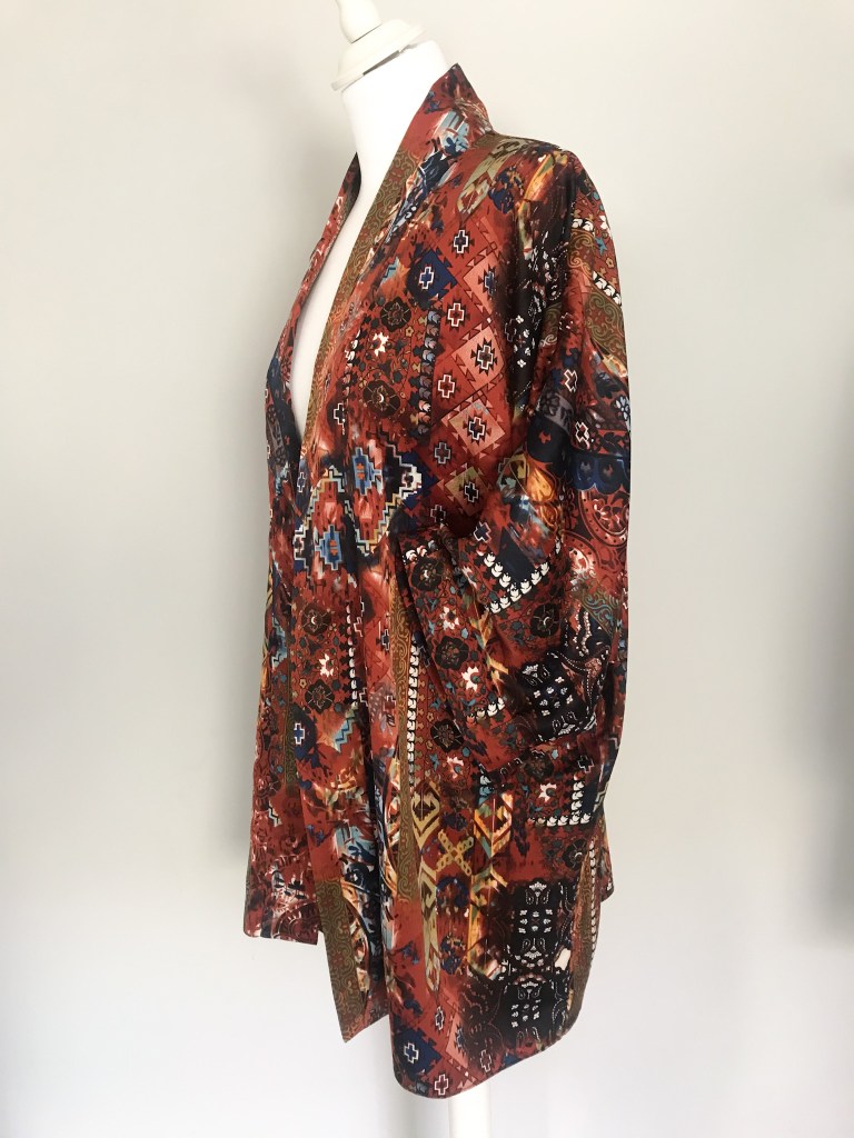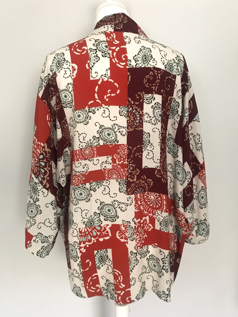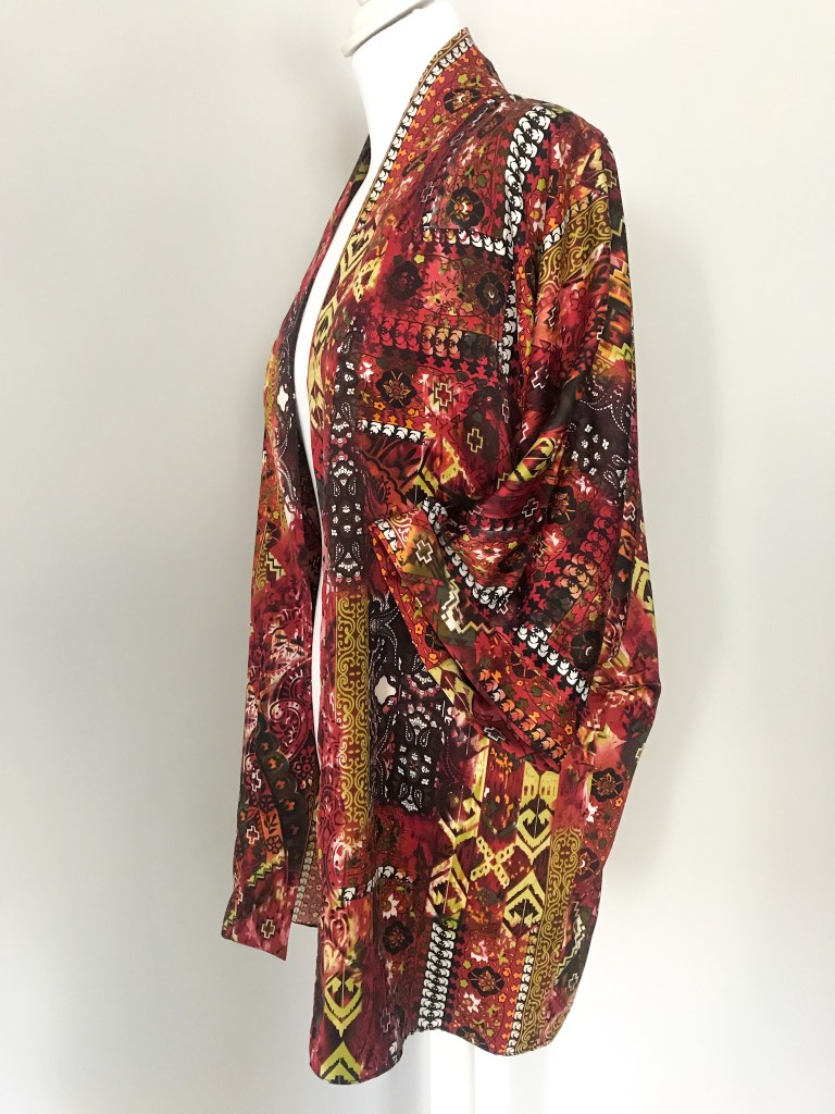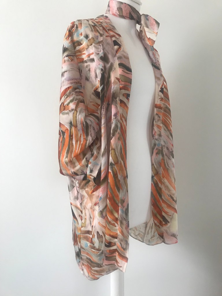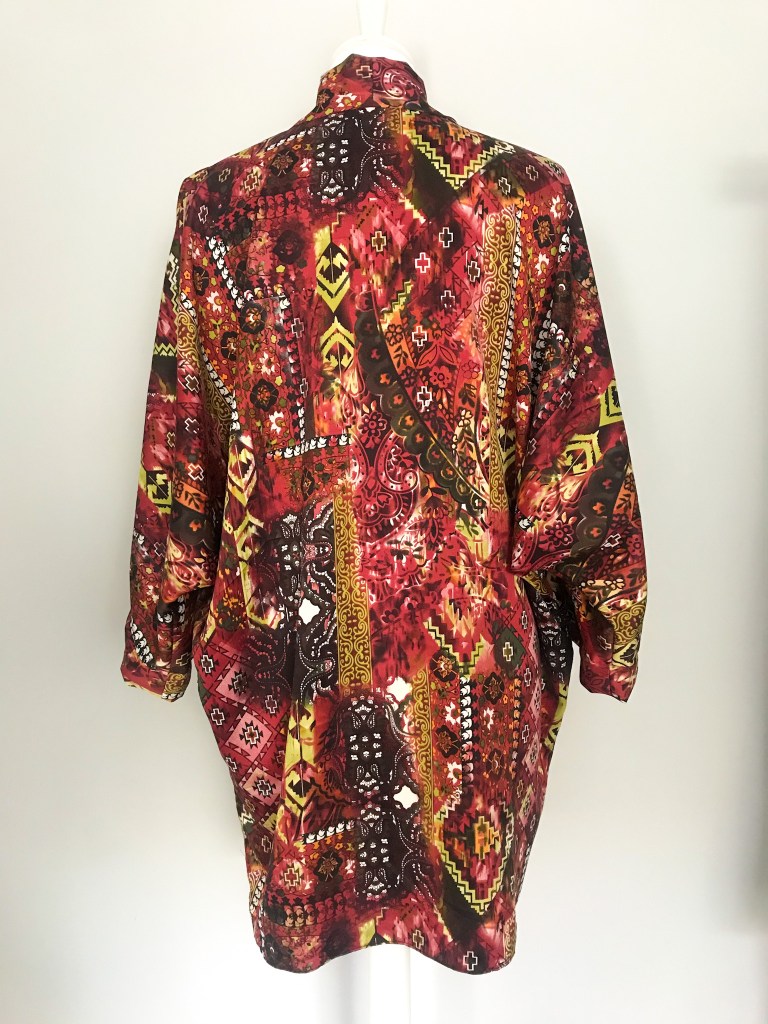 Kimono en crepé fino. El remate del cuello es una tira doble de 5,5 cm, que queda algo más corta a modo de solapa y, en este caso, en vez de puño lleva una manga puesta doble, de manera que al verse el interior se sigue apreciando el estampado. El bajo está rematado con puntada de doble orillo. Largo de la manga 62 cm