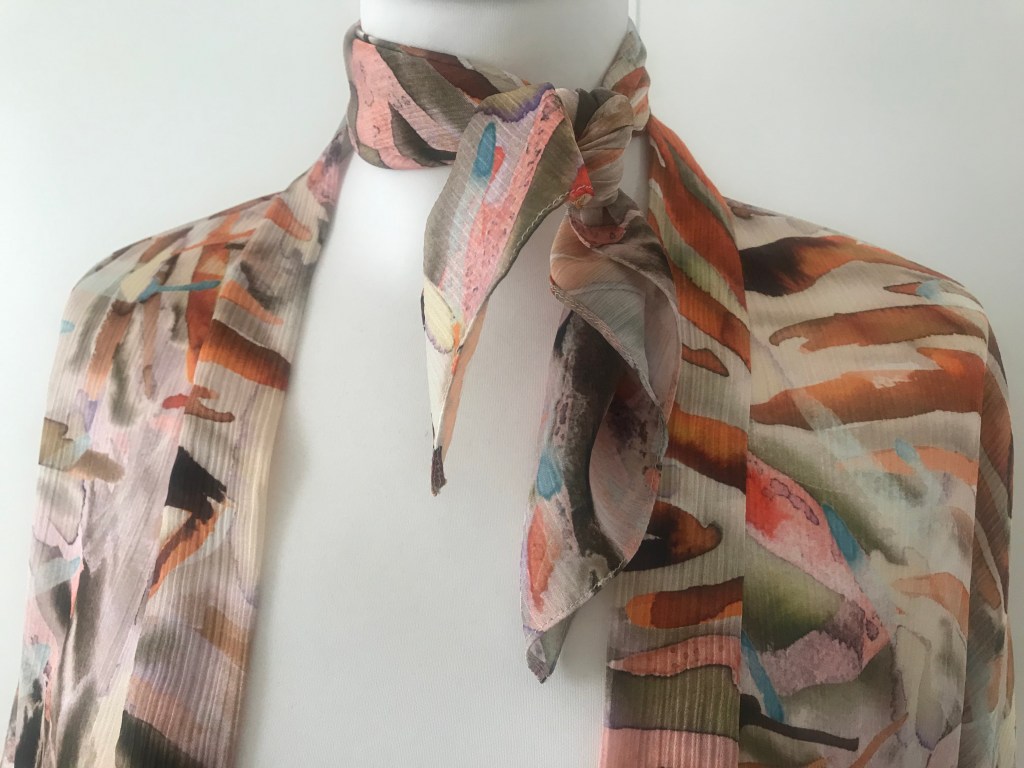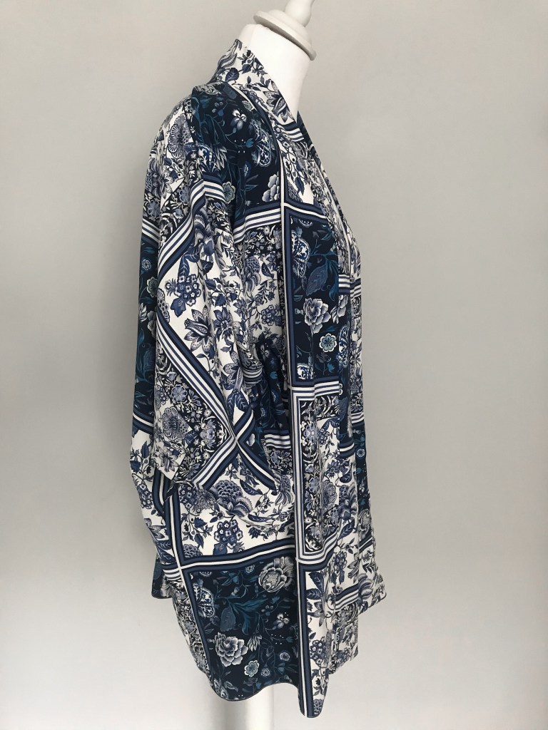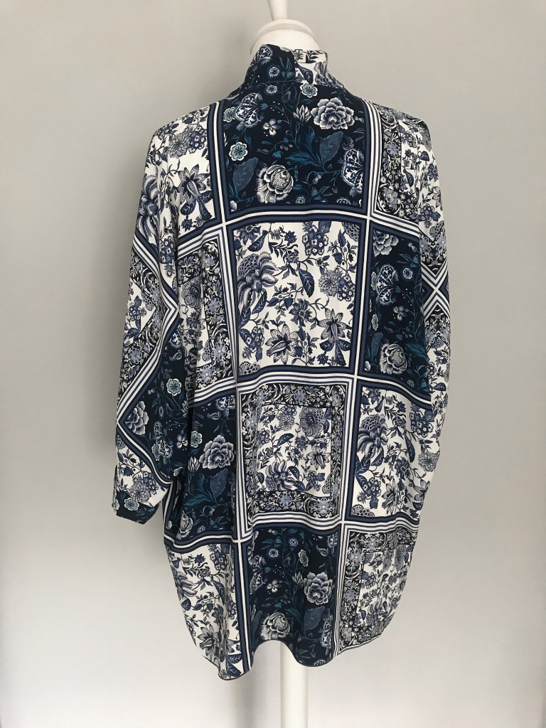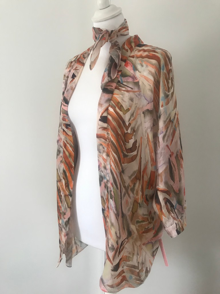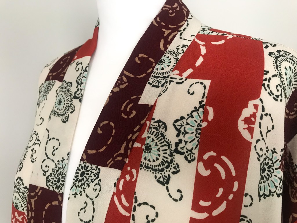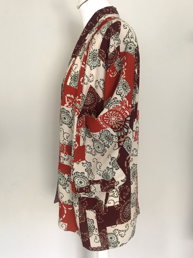 Kimono en crepé fino. El remate del cuello es una tira doble de 5,5 cm, que queda algo más corta a modo de solapa y, en este caso, en vez de puño lleva una manga puesta doble, de manera que al verse el interior se sigue apreciando el estampado. El bajo está rematado con puntada de doble orillo. Largo de la manga 62 cm