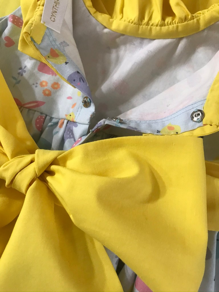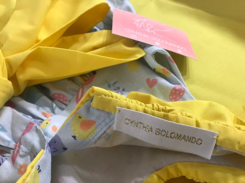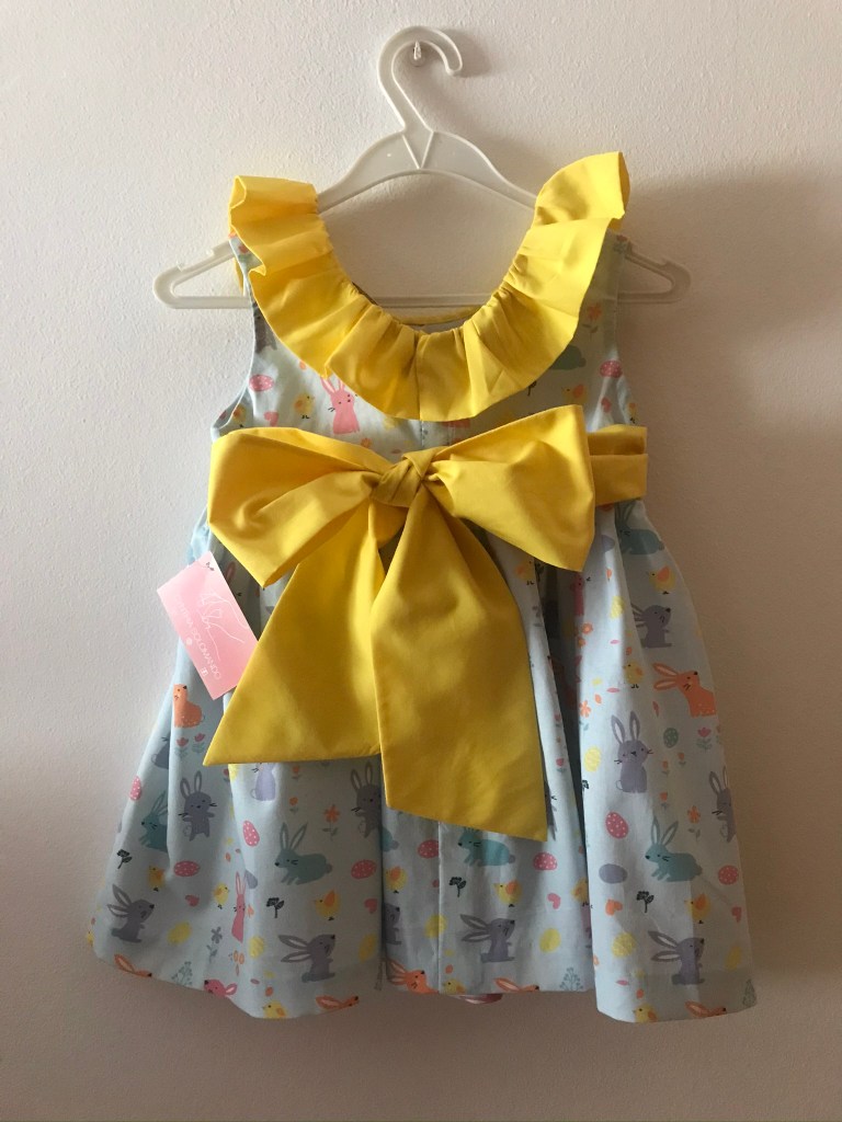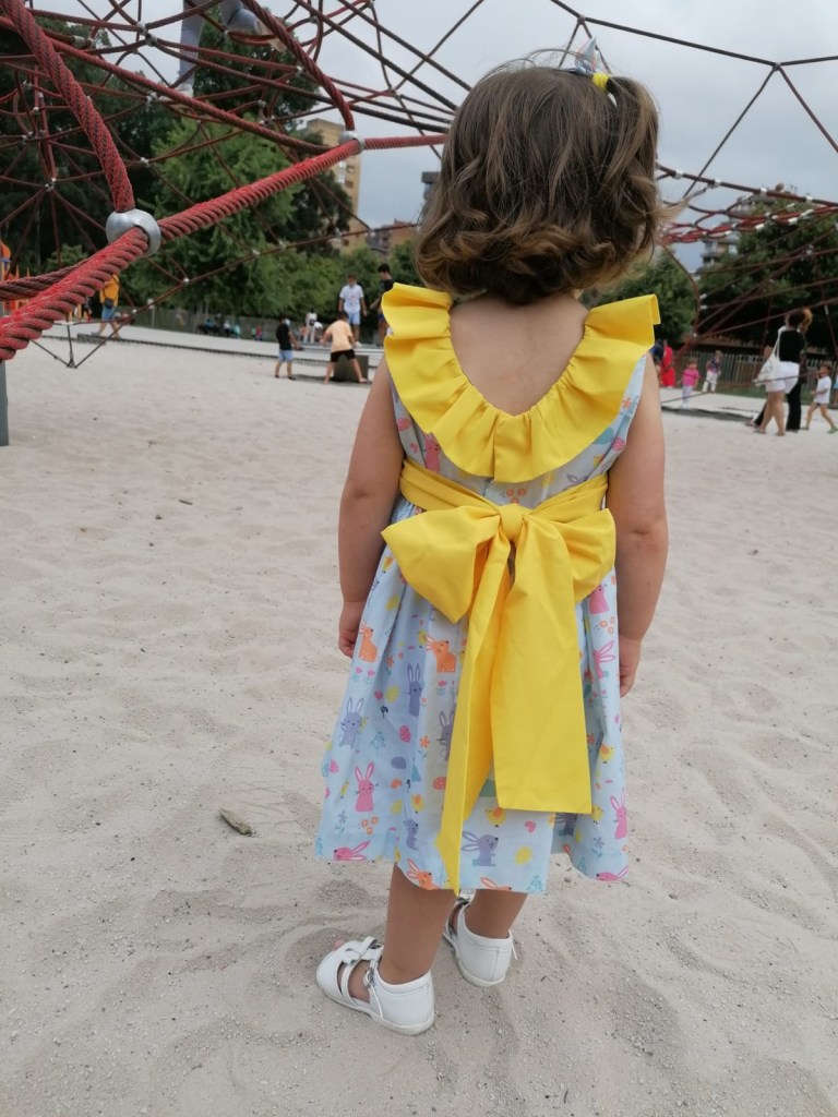 Los dos vestidos llevan dos volantes fruncidos. En el de Marta se los había planteado de capa sin frunce, pero en la prueba decidimos cambiarlo y añadirle el frunce porque nos gustaba más su resultado.