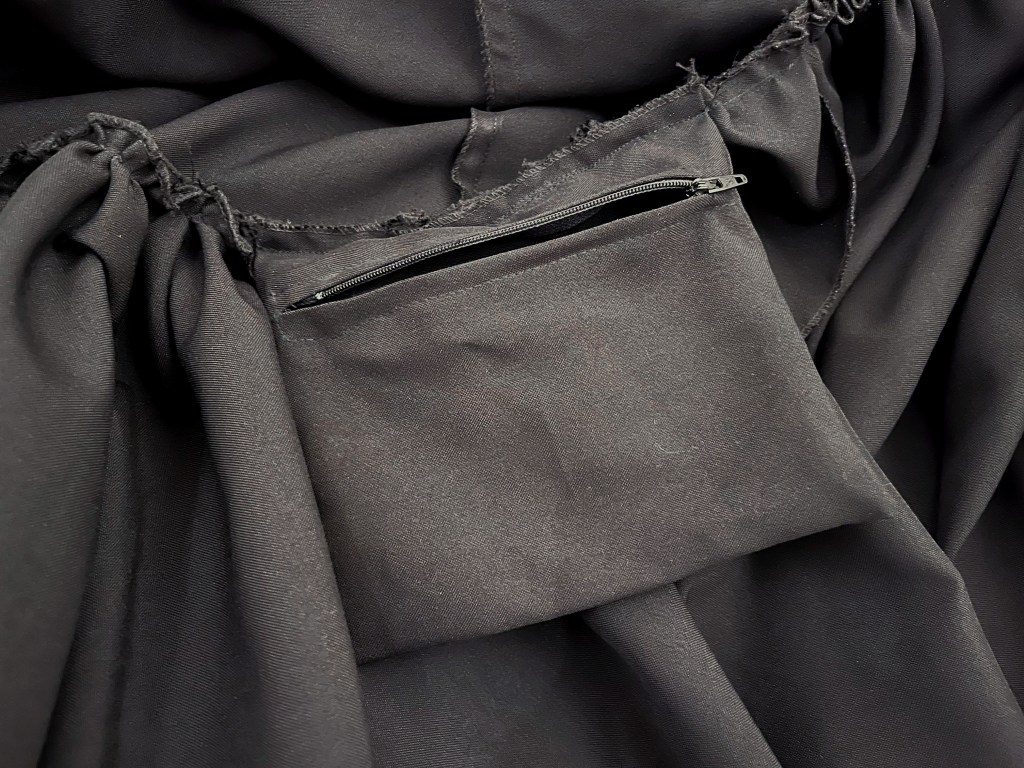 Igual que los otros años, incluí el bolsillo debajo del último volante, utilicé cremallera vista -los trajes de flamenca la llevan así porque es más resistente que la invisible, y sabemos que estos vestidos van apretados a más no poder-, y rematé todo el escote con el cordón que llevan para que quede bien aposentado y que se anuda atrás y se esconde hacia adentro.