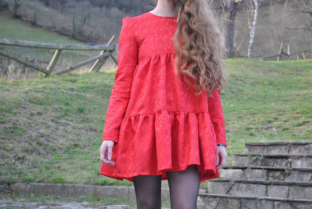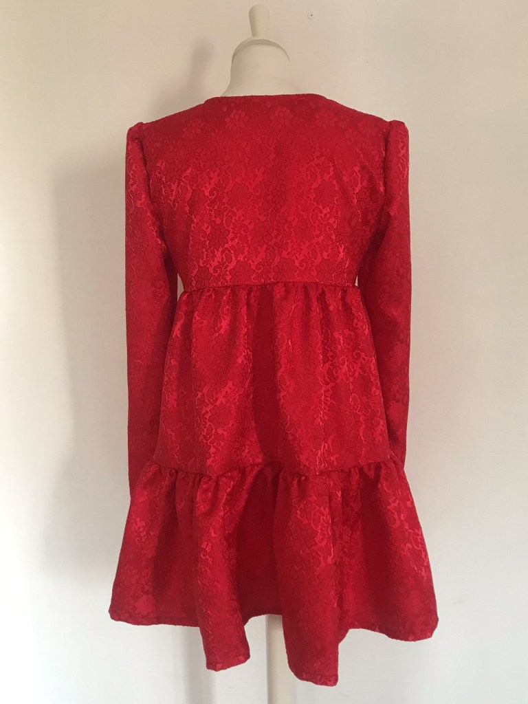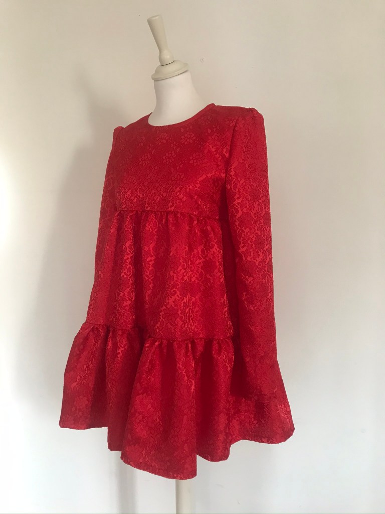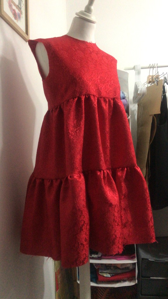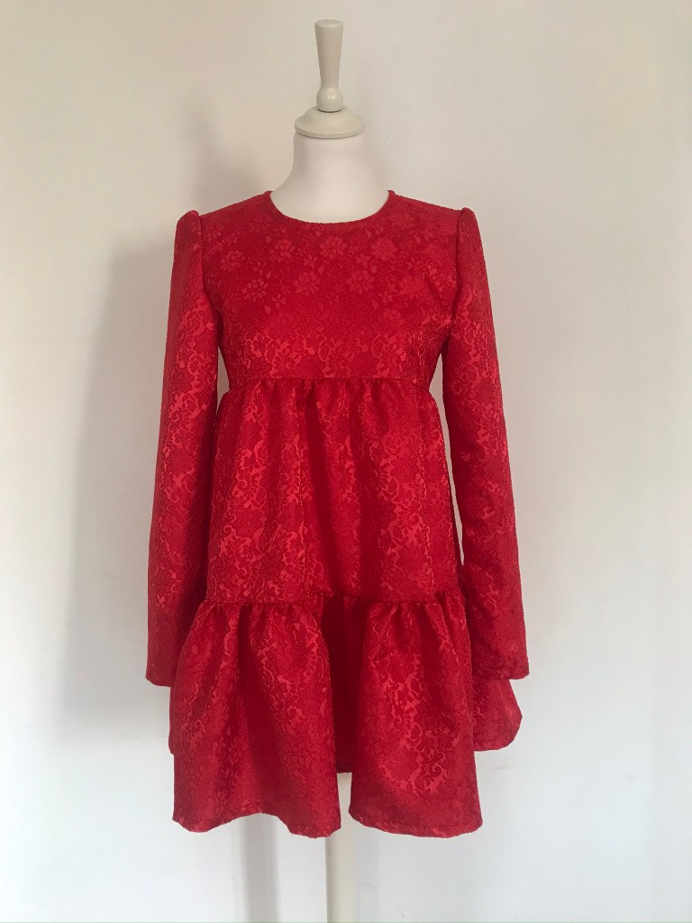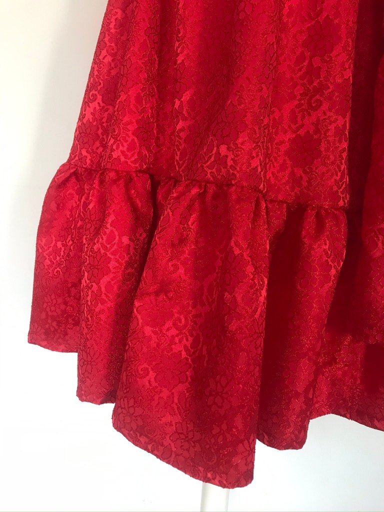 Si hay un color con el que relacione a María es el rojo, así que cuando fui en búsqueda de la tela para hacérselo, y se me cruzó este brocado, supe que era el idóneo.