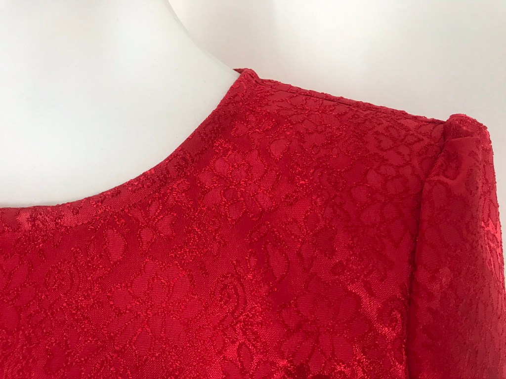 Rematé todo el cuello con un bies del mismo brocado. Esta vez, como novedad, cosí la etiqueta junto con el pespunte del bies del cuello, y me gusta mucho lo bien integrada que queda así.