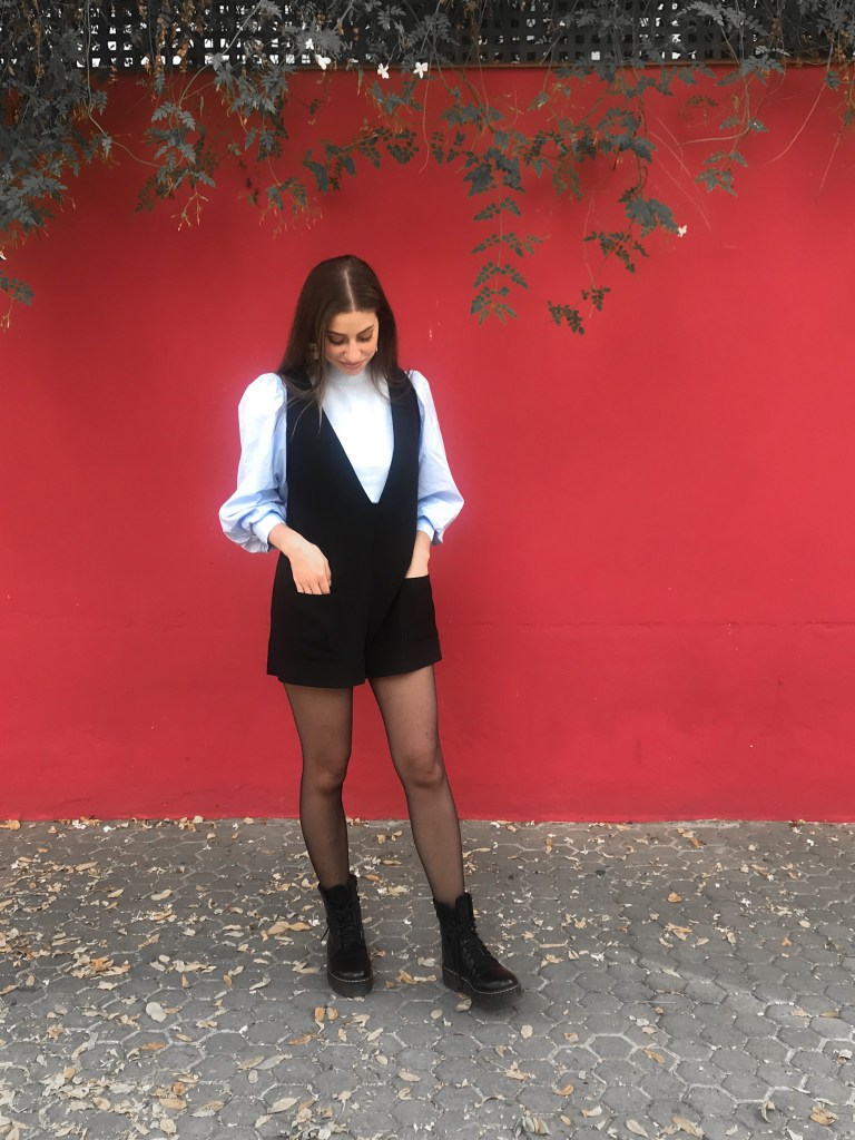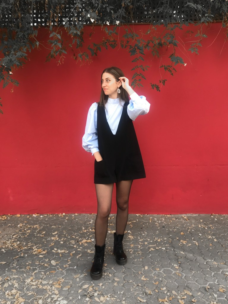 El escote superior lo hice con una forma tipo pico pero con los dos lados redondeados; el de abajo es más pequeñito, delimitando con la cintura del pantalón. Cierra con un botón forrado en el mismo crepé del mono, que es meramente decorativo porque su premisa era «comodidad y practicidad». Laura no quería necesitar ayuda a la hora de poder ir al servicio -todas sabemos que esto siempre es un rollo-, así que su espalda es totalmente decorativa, el mono cierra con una cremallera lateral y botones en el hombro.