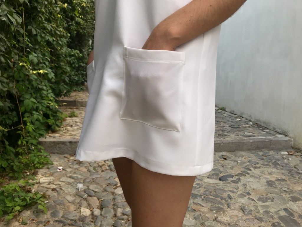 Industrialicé el patrón delantero para trasladar las dos pinzas al costado, y obtener así una pinza francesa, que en cuerpo con pecho favorece y a mi, particularmente, me gusta mucho. El escote lo hice barco para poder darle protagonismo a la espalda.