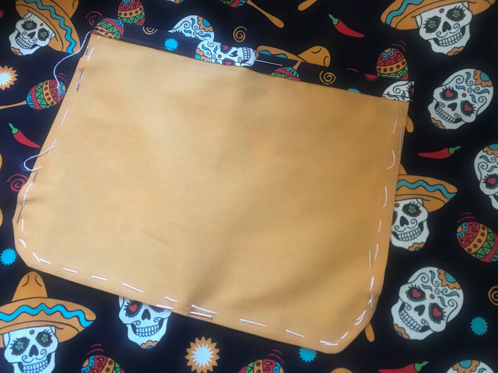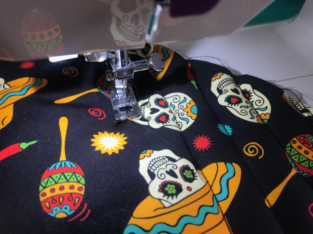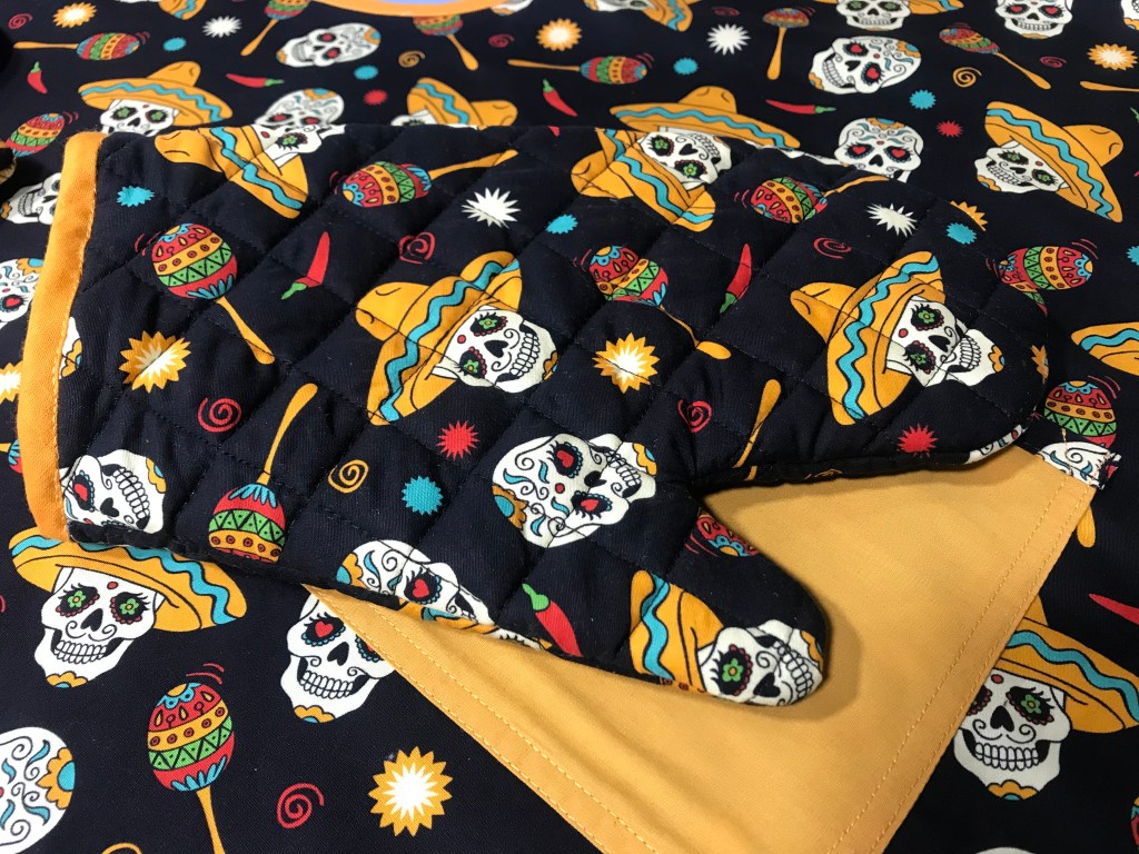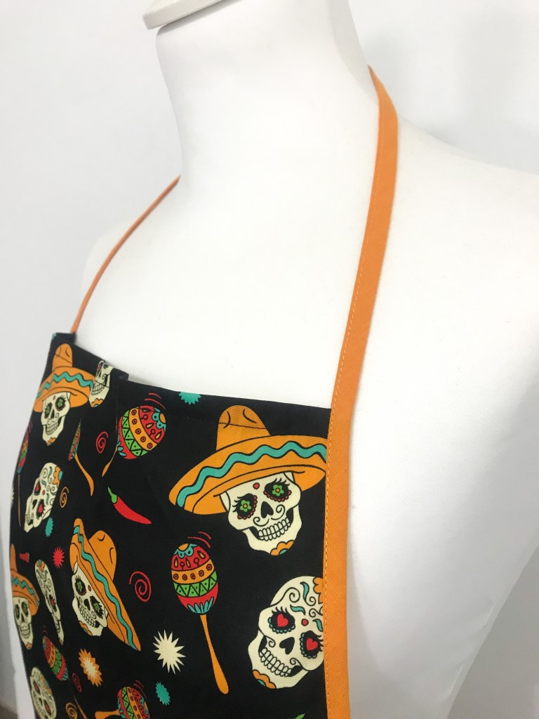 Necesitaba un estampado molón, guata y bies. Esta tela de calaveras me pareció ideal porque el negro del fondo hace que sea sufrido y si se mancha cocinando disimule hasta que vaya a la lavadora, y las calaveras en tonos naranjas le dan mucha vivacidad. La verdad que iba buscando motivos de cocina, pero esta me gustó nada más verla y me decanté por ella. Para el bies estaba claro que tenía que ser naranja, ¿no?