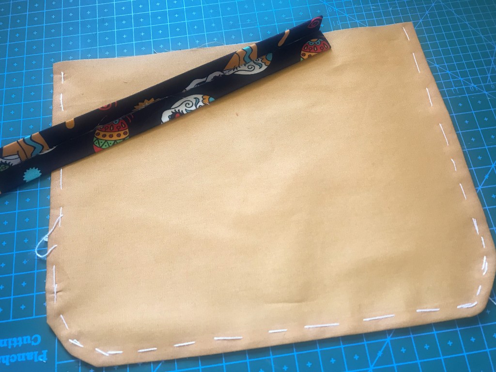 Para el delantal corté un bolsillo central en un mostaza que contrastaba. Todo el borde está rematado, también, con un bies, que hace las veces de lazo para atar en la espalda.