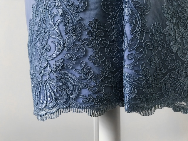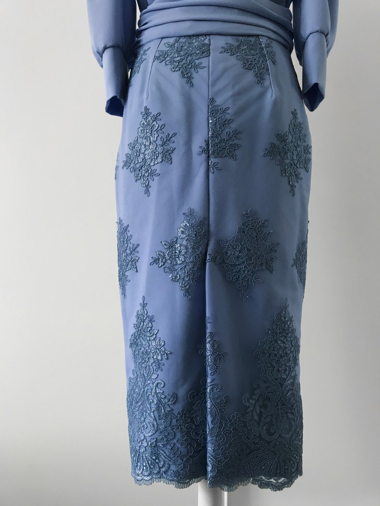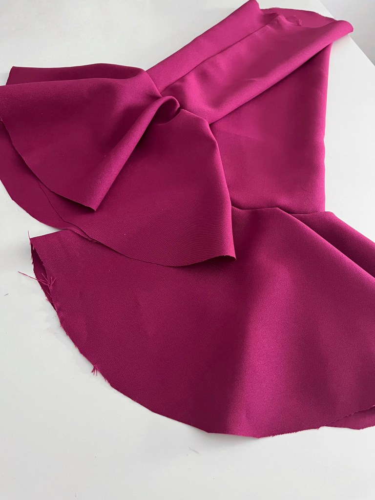 Para la parte de la falda utilicé dos tejidos: un crepe y gasa. Como os contaba, ella quería ese efecto de movimiento y jugar con diferentes alturas en el bajo, así que confeccioné una falda de media capa en crepe, para que le diera la consistencia interior e hiciera las veces de «forro» para que no transparentase, y encima dos faldas de media capa de gasa, rematadas con un cordoncillo. El bajo iba en disminución, más corto por delante y más largo por detrás.