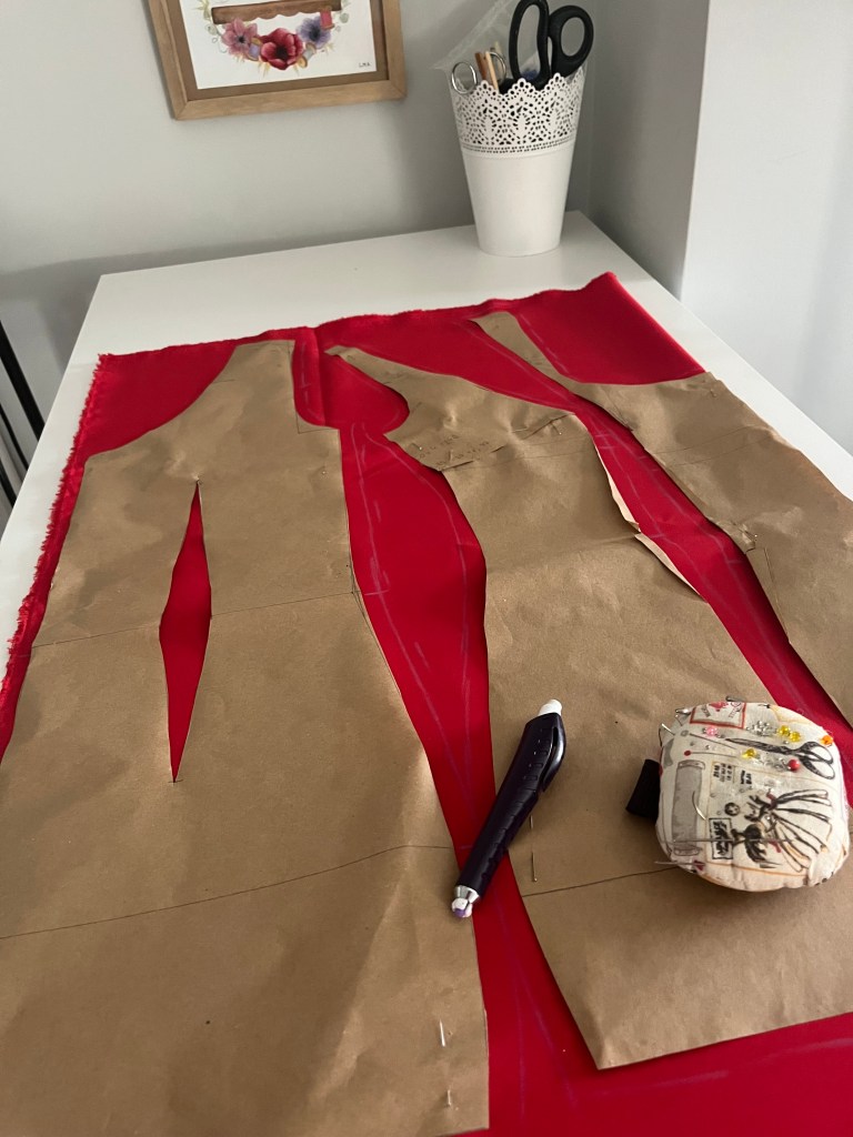El cuerpo fue lo que mas tiempo me llevó con diferencia. Nos decantamos por un tul color carne con bordado rojo y el mismo crepe de la falda para hacer una estructura interna. En primer lugar la ideamos palabra de honor, pero con tanta tela en la falda era bastante peso como para un palabra de honor en su caso, así que finalmente hice el cuerpo con tirantes y encima todo el tul con un escote barco bastante abierto para que no tuviera esa sensación de ahogo, y una manguita tres cuartos.